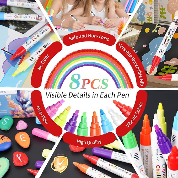 - Vivid Colors for Creative Projects: SPACEZHUA classic chalk marker set is available in 8 vibrant colors, featuring white, red, orange, blue, pink, green, yellow, purple. Whether you're designing on chalkboard, whiteboard, windows, glass, metal, ceramic, refrigerator surfaces, calendars, mirrors, plastic, display cabinets, car windows, or any other non-porous surfaces, these vivid colors bring a professional and artistic touch to your creations.