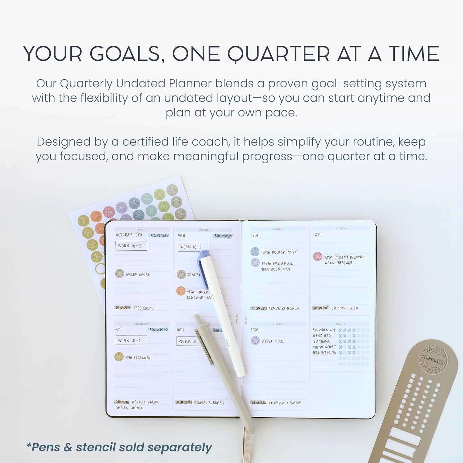 - Comprehensive Goal-setting journal: The MäksēLife undated weekly planner supports you every step of the way with a system for meaningful goals and gentle weekly nudges to keep you on track