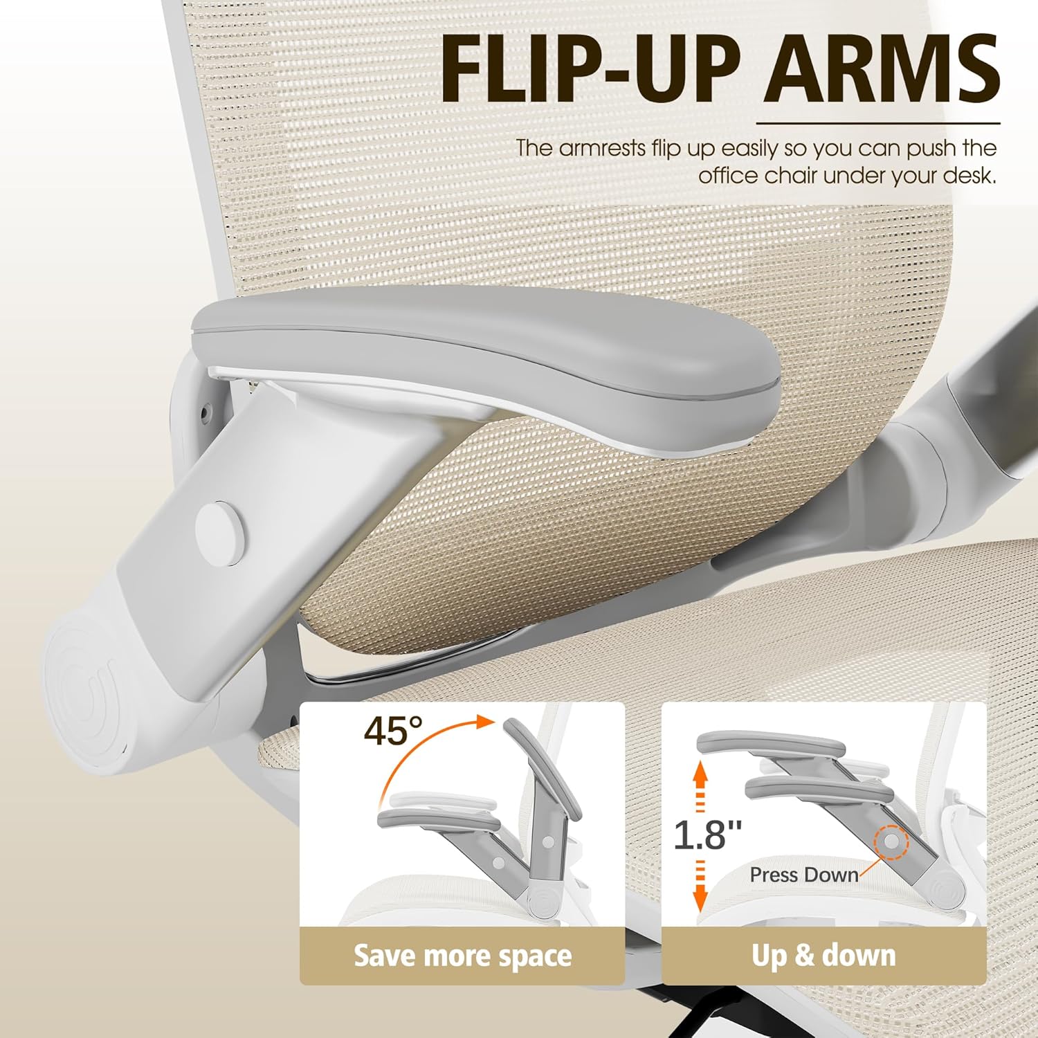 - 【ADJUSTABLE FLIP-UP ARMS】-If you want to make the most of the space under the table or choose a home desk chair for a small space/bedroom, this is the office chair for you! The GABRYLLY ergonomic office mesh chairs' armrest can be folded up(45°) and be adjusted the arms' height(1.8'').