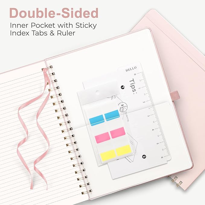 - SPIRAL NOTEBOOK: RETTACY Spiral Notebook comes in a A4 (8.5'' Γ 11'') size, 110 Numbered Pages, Leather Hardcover, Sturdy Twin-wire Spiral Bound, 7 mm college ruled writing space, 100 GSM Paper, Pen Holder, Elastic Closure Bands, Inner Pocket, Ribbon Bookmark, Lightweight Ruler, Sticky Index Tabs