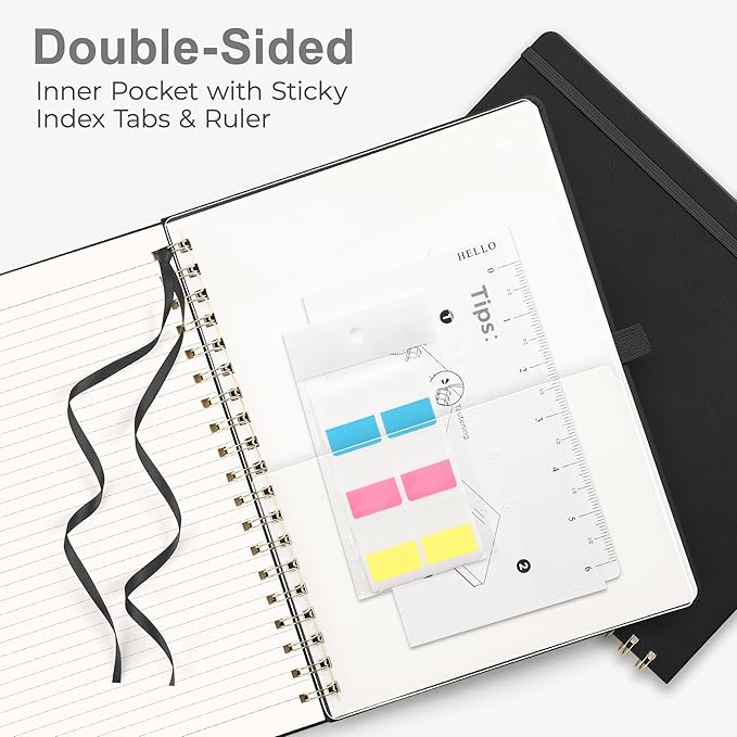 - SPIRAL NOTEBOOK: RETTACY Spiral Notebook comes in a A4 (8.5'' Γ 11'') size, 110 Numbered Pages, Leather Hardcover, Sturdy Twin-wire Spiral Bound, 7 mm college ruled writing space, 100 GSM Paper, Pen Holder, Elastic Closure Bands, Inner Pocket, Ribbon Bookmark, Lightweight Ruler, Sticky Index Tabs