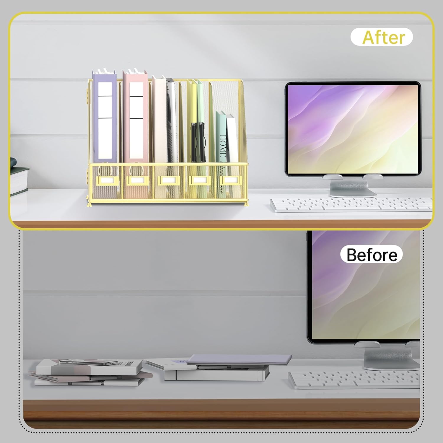 SUPEASY Desk Organizers Metal Desk Magazine File Holder with 5 Vertical Compartments Rack File Organizer for Office Desktop, Home Workspace, Gold Plus