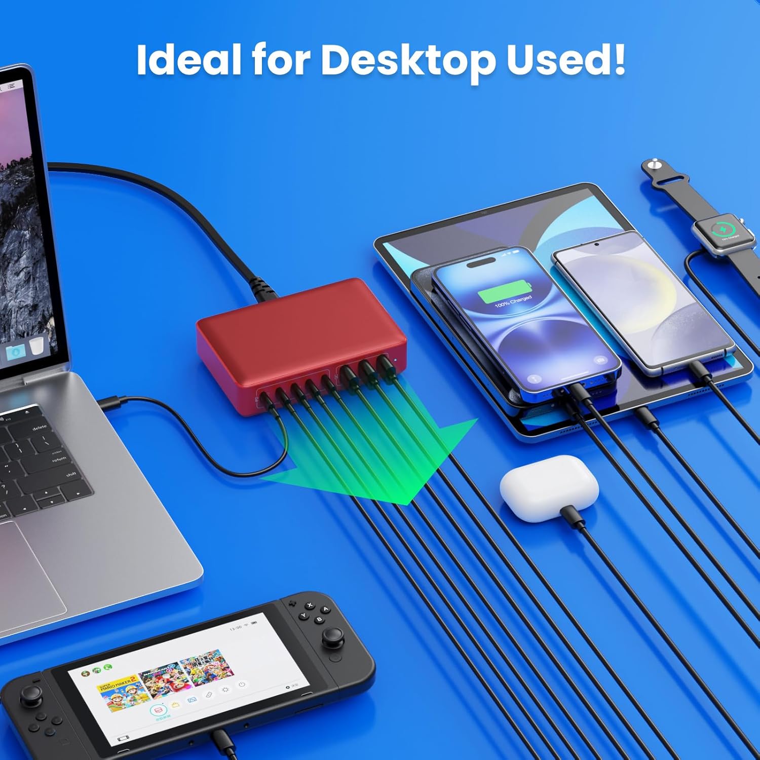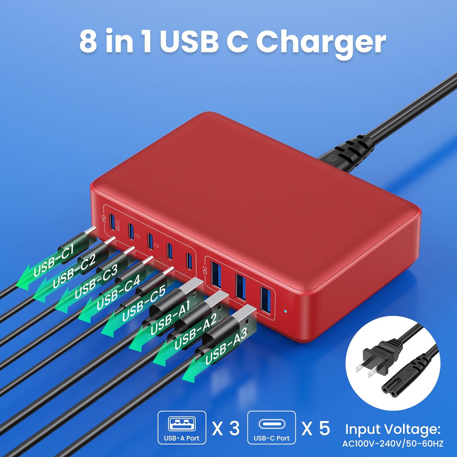 - γ300W Super Fast 8-in-1 Usb C Charger BlockγOur USB charger provides multi charging options to meet your different needs. With 5*USB C ports and 3*USB A ports, no need for more adapters, you can use just one outlet to plug in laptops, tablets, smartphones, Bluetooth speakers and other small gadgets like earbuds, smartwatches, game consoles etc.Our USB C charging stations feature 8 independent output ports, ensuring all devices can charge simultaneously at full speed without power sharing and disconnection,this 8-in-1 charging station will reduce your accessories burden and help you create an organized and clean desktop.