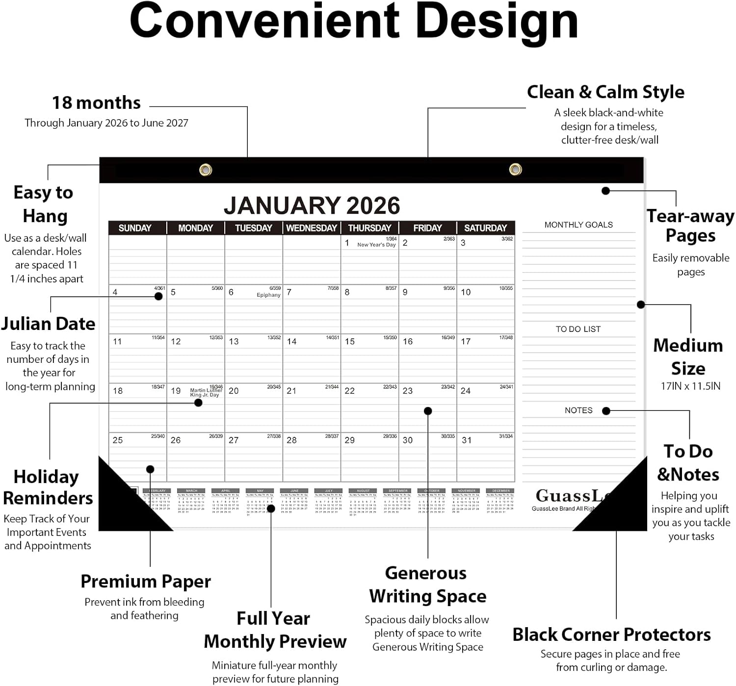 GuassLee Desk Calendar 2026-2027, 3 Packs, 18 Months Calendar 17" × 11.5" Desk Calendar from January. 2026 to June. 2027 with Julian Date, To-do List, Notes, Monthly Goals, for Home School Office