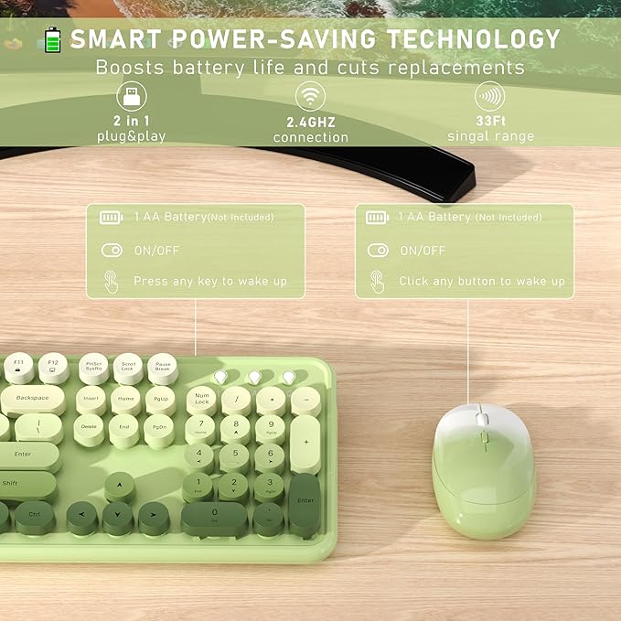 Wireless Keyboard and Mouse, Full-Size Retro Typewriter Keyboard with Round Keycaps, 2.4GHz for Windows, Mac, Laptop, PC, Desktop (Green Gradient)