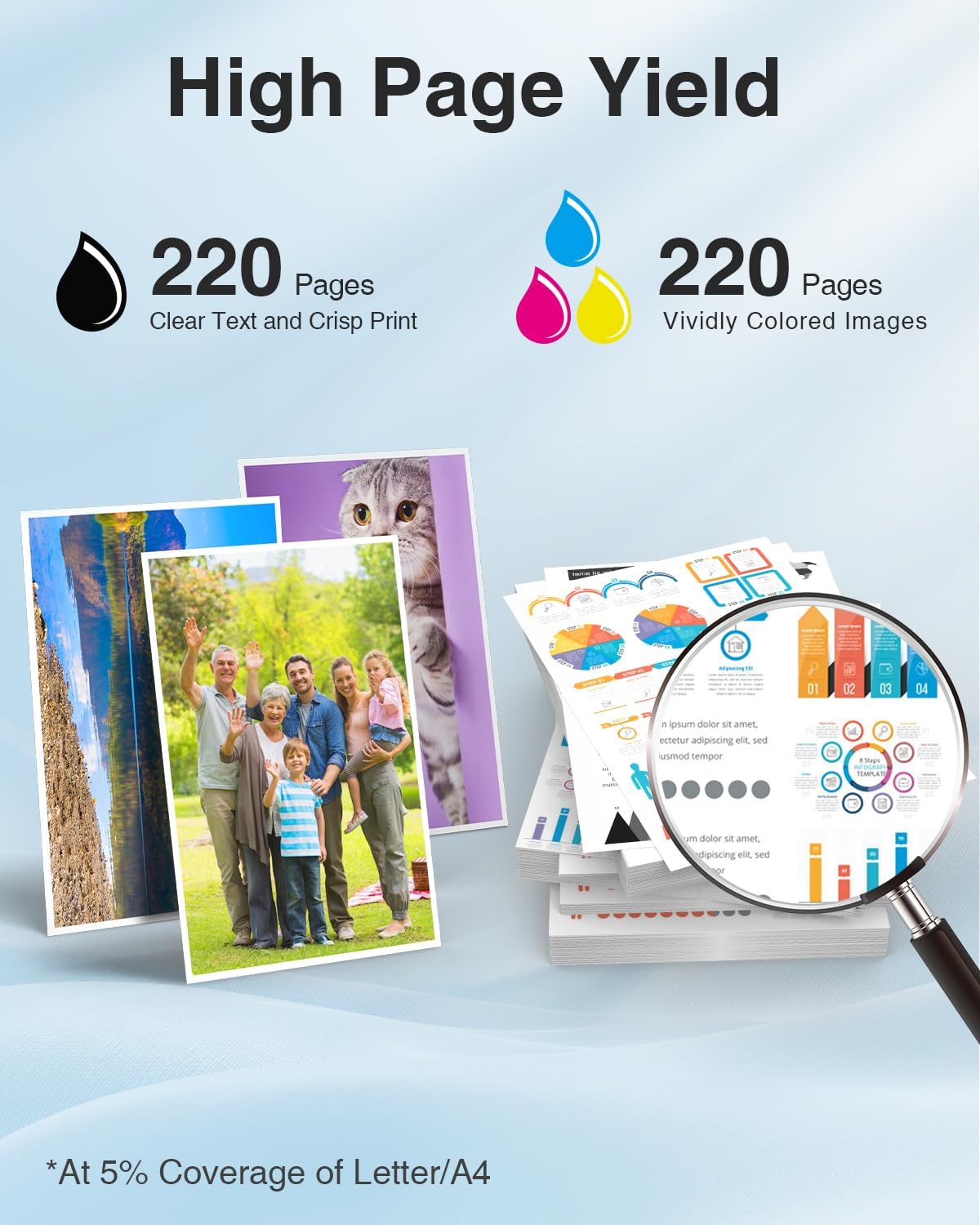 - γHigh Page YieldγCompatible LC401 ink cartridges. UP to 220 pages per LC401 black ink cartridge, and 220 pages for LC401 color ink cartridge (Letter/A4, at 5% coverage).