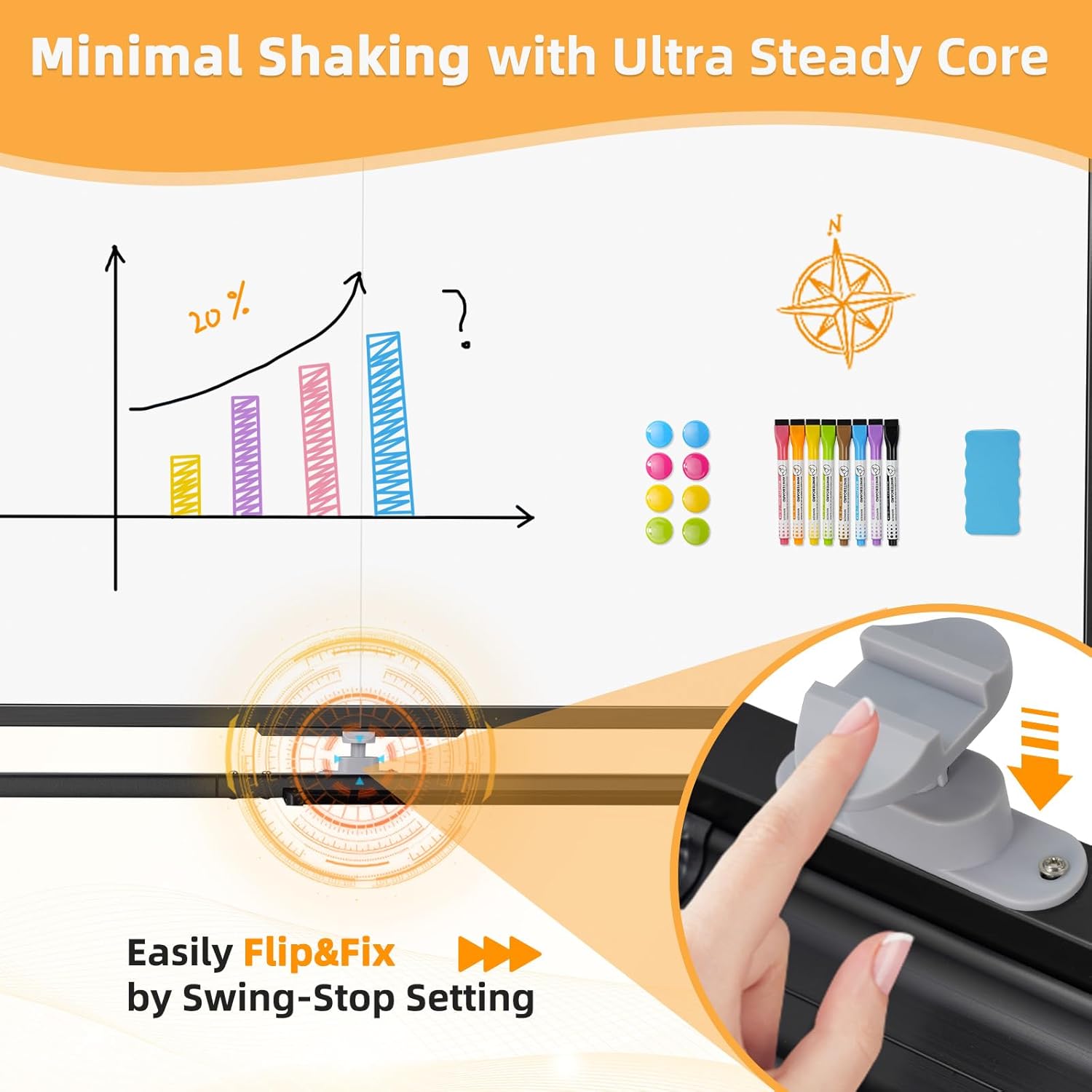 - Solid & Stable - Built with premium materials, rust protection, ABS corners, and a sturdy frame, this rolling white board is durable and secure. Four locking caster wheels ensure easy mobility and complete stability when writing or wiping