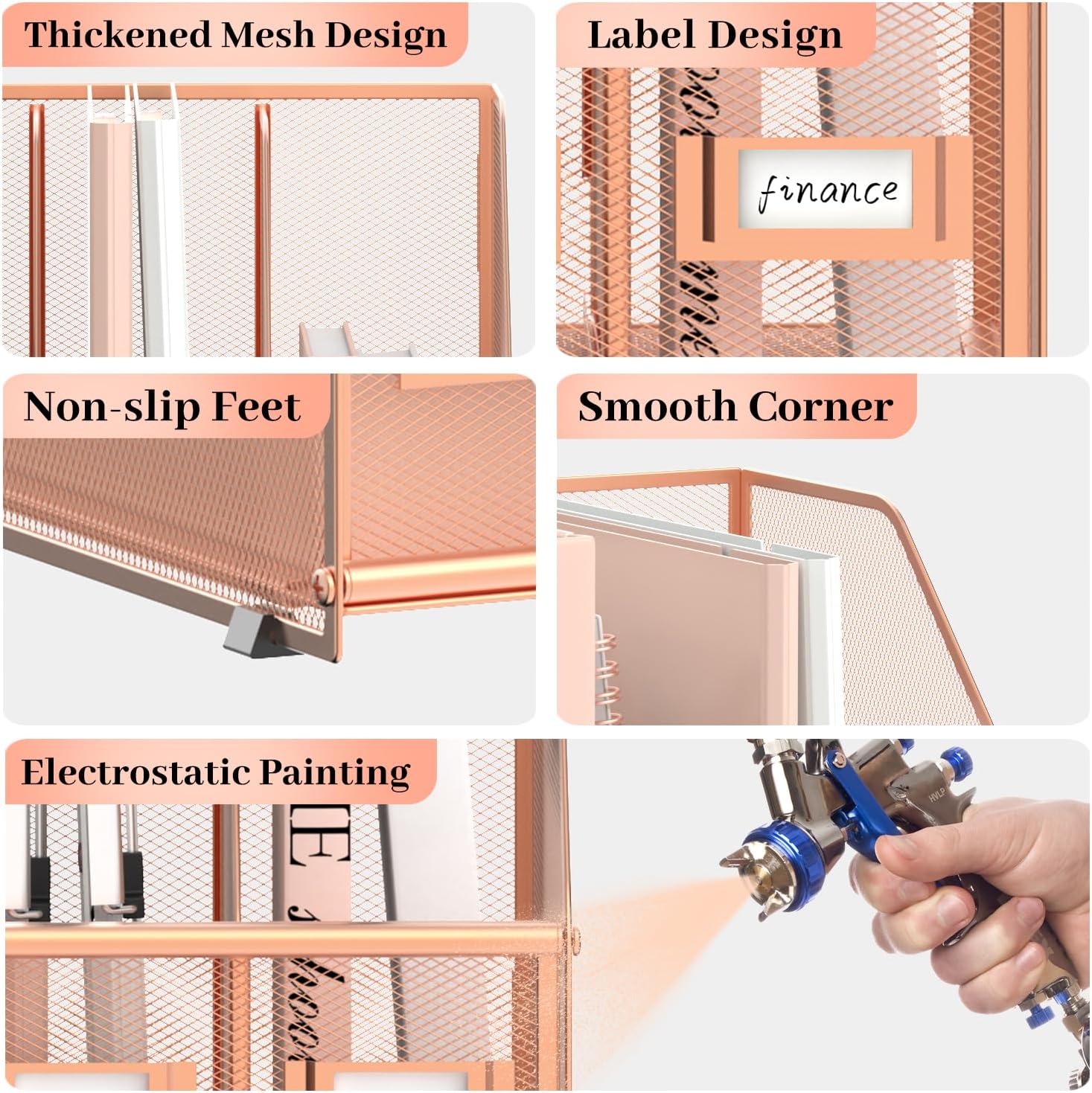- [Humanized Detail Design] The file holder for desk has 5 vertical compartments, which is convenient for classifying office supplies. Replaceable tags are a great help for labeling, classifying, and quickly finding the desired item. Anti-skidding foot make the binder organizer difficult to slide on the desktop.