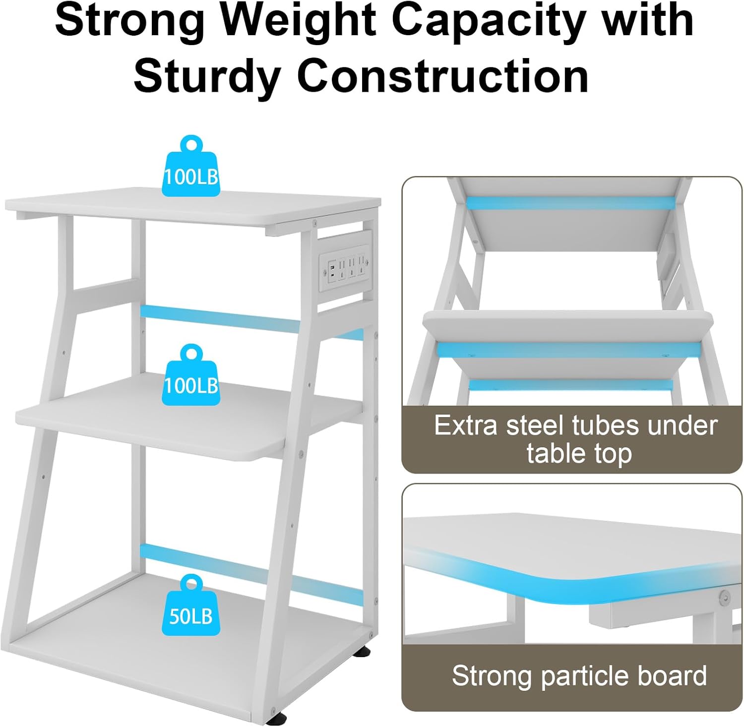 - 【Sturdy & Durable】The heavy duty printer stand supports 250 lbs in total. the powder-coated steel tube frame size is 1’’x1’’, and with extra load bearing tube under the top shelve , The solid construction,high quality particle board and industrial grade wheels make it quite a durable printer shelf that you can count on for years.