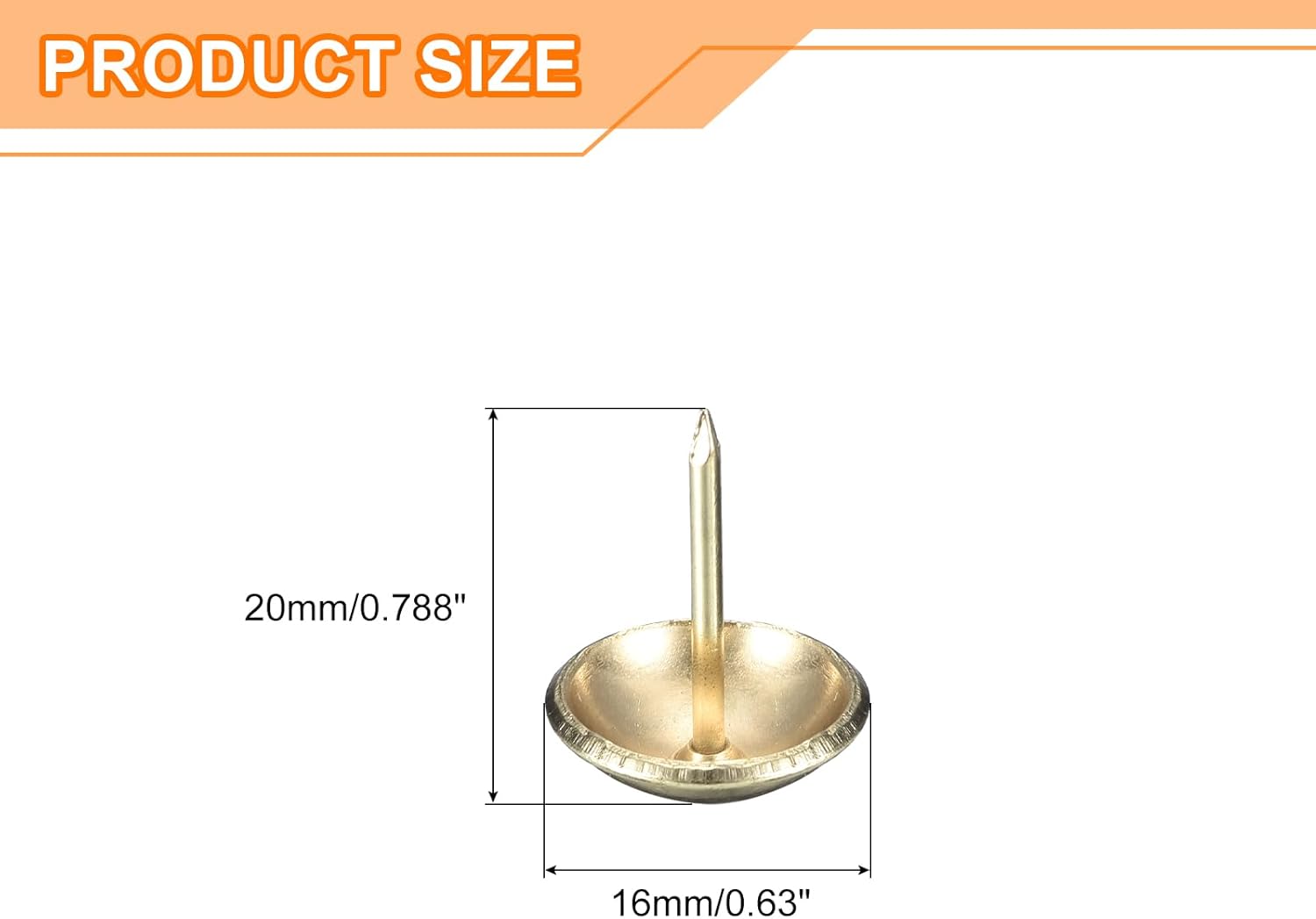 - Specifications: Material: Carbon steel; Color: Gold; Diameter of nails head: 16mm/0.63inch; Shank length: 20mm/0.788inch; Package Content: 50Pcs x Upholstery Tacks Nail Pins