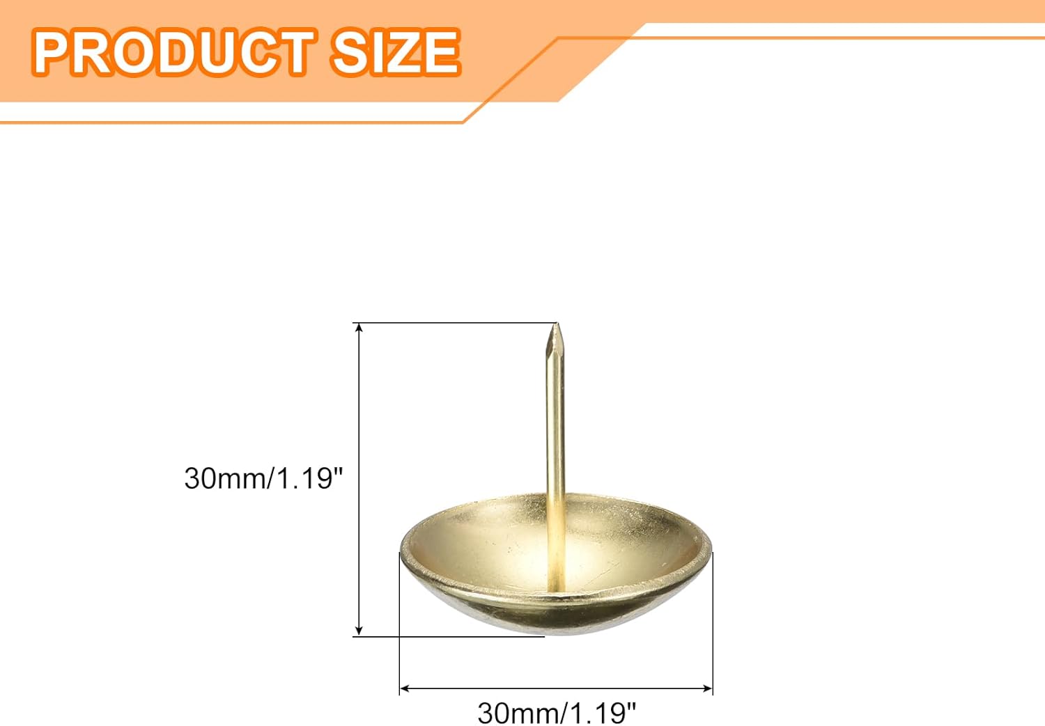 - Specifications: Material: Carbon steel; Color: Gold; Diameter of nails head: 30mm/1.19inch; Shank length: 30mm/1.182inch; Package Content: 30Pcs x Upholstery Tacks Nail Pins