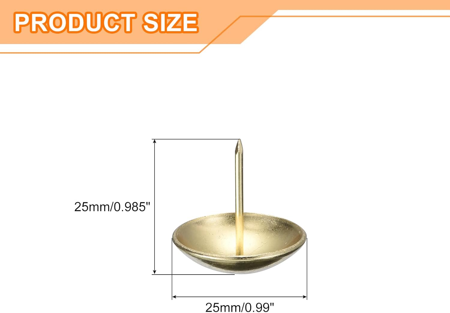 - Specifications: Material: Carbon steel; Color: Gold; Diameter of nails head: 25mm/0.99inch; Shank length: 25mm/0.985inch; Package Content: 30Pcs x Upholstery Tacks Nail Pins