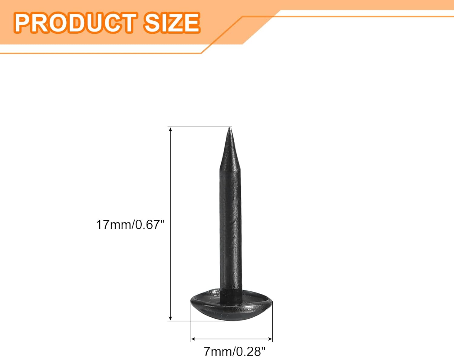 - Specifications: Material: Carbon steel; Color: Black; Diameter of nails head: 7mm/0.28inch; Shank length: 17mm/0.67inch; Package Content: 50Pcs x Upholstery Tacks Nail Pins