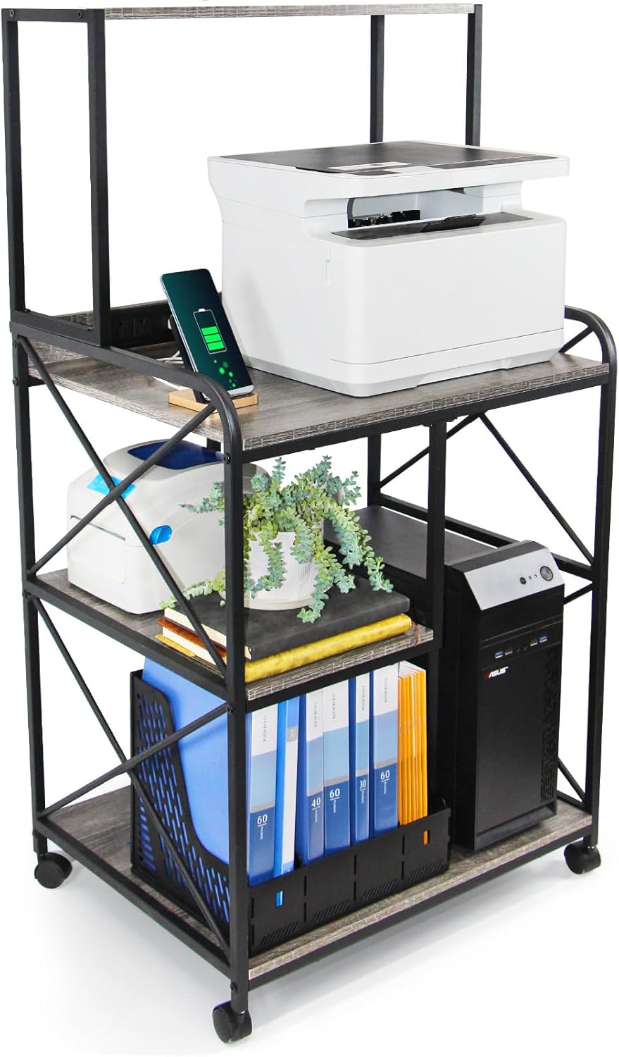 - 【Multipurpose Rolling Printer Cart】The printer stand includes rolling casters, 2 of the 4 wheels are lockable to keep the cart in position. So you can either move the stand around flexibly or keep the stand stationary with lockable wheels. This printer cart is not just for holding printers, but also serves as a file cabinet, office storage rack, paper shredder stand, microwave oven stand, kitchen baker's rack, and file rack organizer. Perfectly for organizing your office or living space.