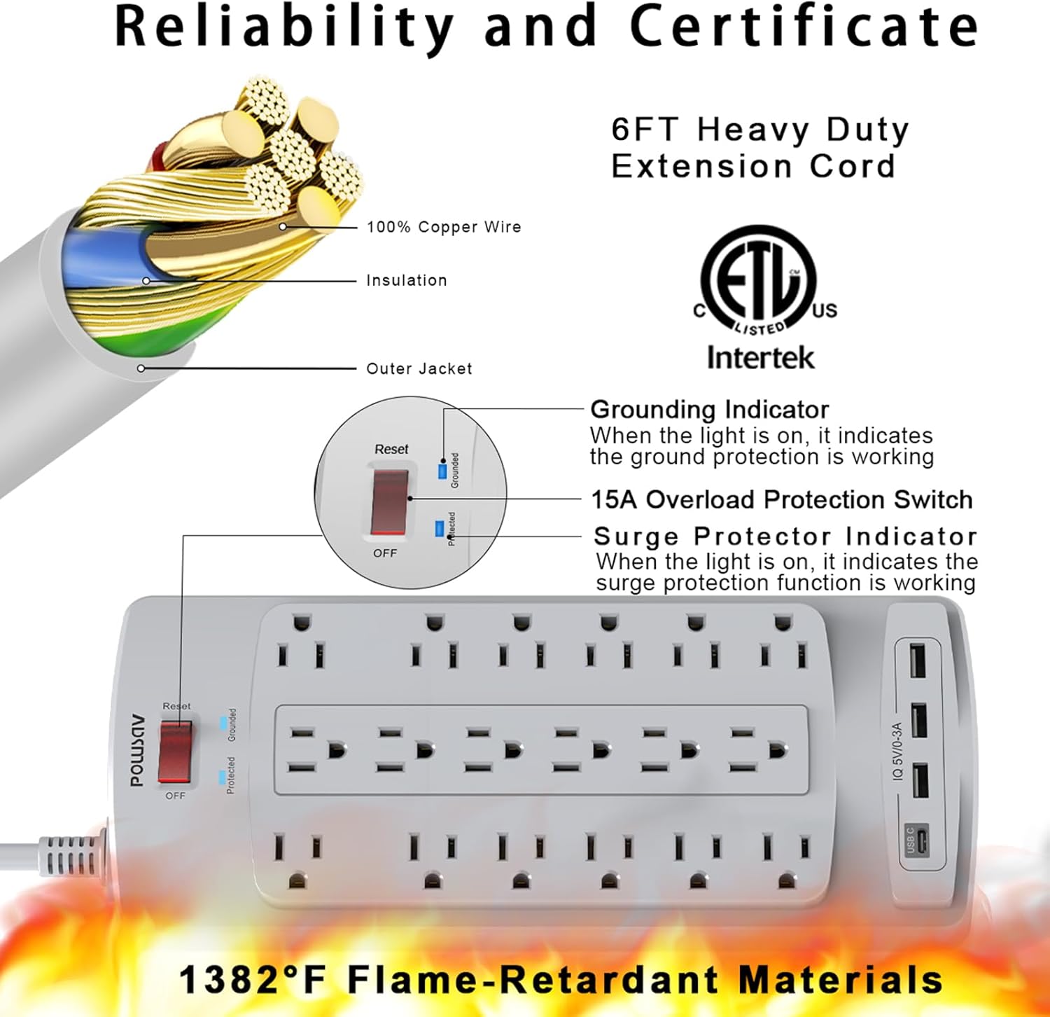 - Safety and Certificate: ETL safety certified, with extension cord and other major components certified by UL. The over current protection switch limits the power strip's working current to certain setting, so it will not get hot during usage. Environmental protection and fire-resistance PC shell with flame retardant at 1382β makes it more durable and longer lifetime.
