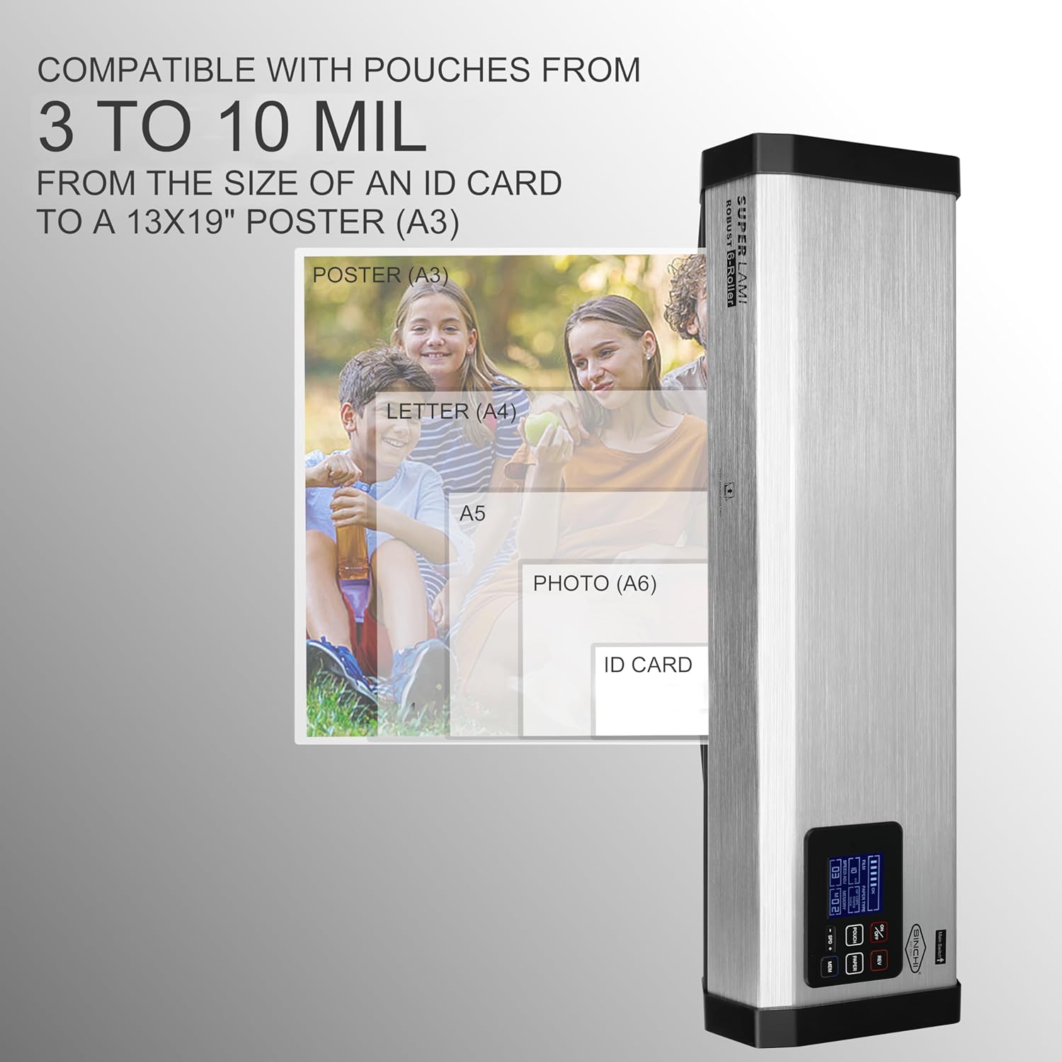 - 【Wide Compatibility】The 13-inch inlet accepts all standard pouches from ID card to 13" x 19" poster size, 3 to 10 mil per side.