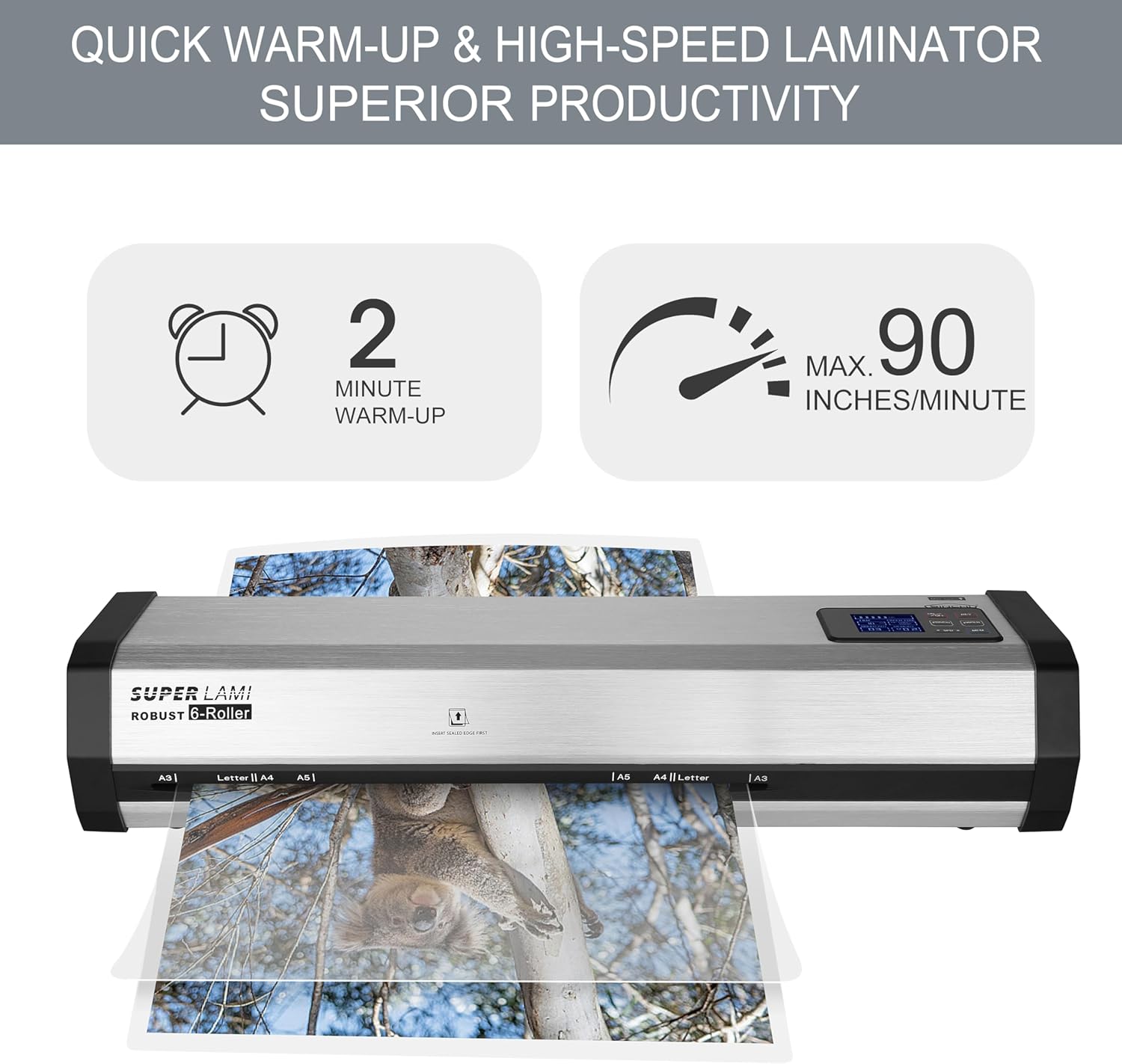 - 【Superior Productivity】The combination of 2-minute warm-up & maximum 90 inches/minute speed saves you valuable time on lamination projects. It takes only three minutes to laminate ten 3-mil letter-size pouches from turning on the machine.