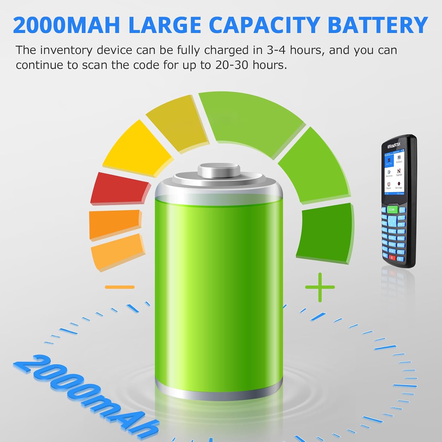 - 【2000mAh battery and 16M storage space】- The portable barcode scanner has a built-in lithium polymer battery, which can be charged with a USB data cable. The capacity is 2000 mAh. Our bar code scanners readers can be fully charged in about two hours and can be used for 60 hours. When you want to transmit 10,000 barcodes, you can use text upload to improve your work efficiency