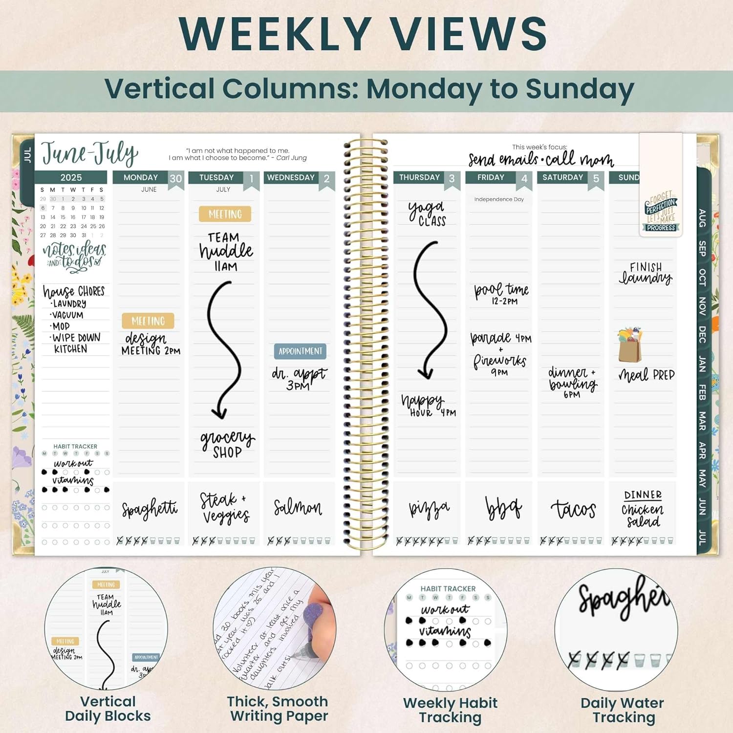 - Vertical Weekly Layout: The weekly views in this planner 2025-2026 run Monday to Sunday with even space for each day. Daily columns are 1.5β wide x 7.7β tall, perfect for tracking hourly appointments. Each week features a quote, top focus items, habit tracker, and daily water intake.