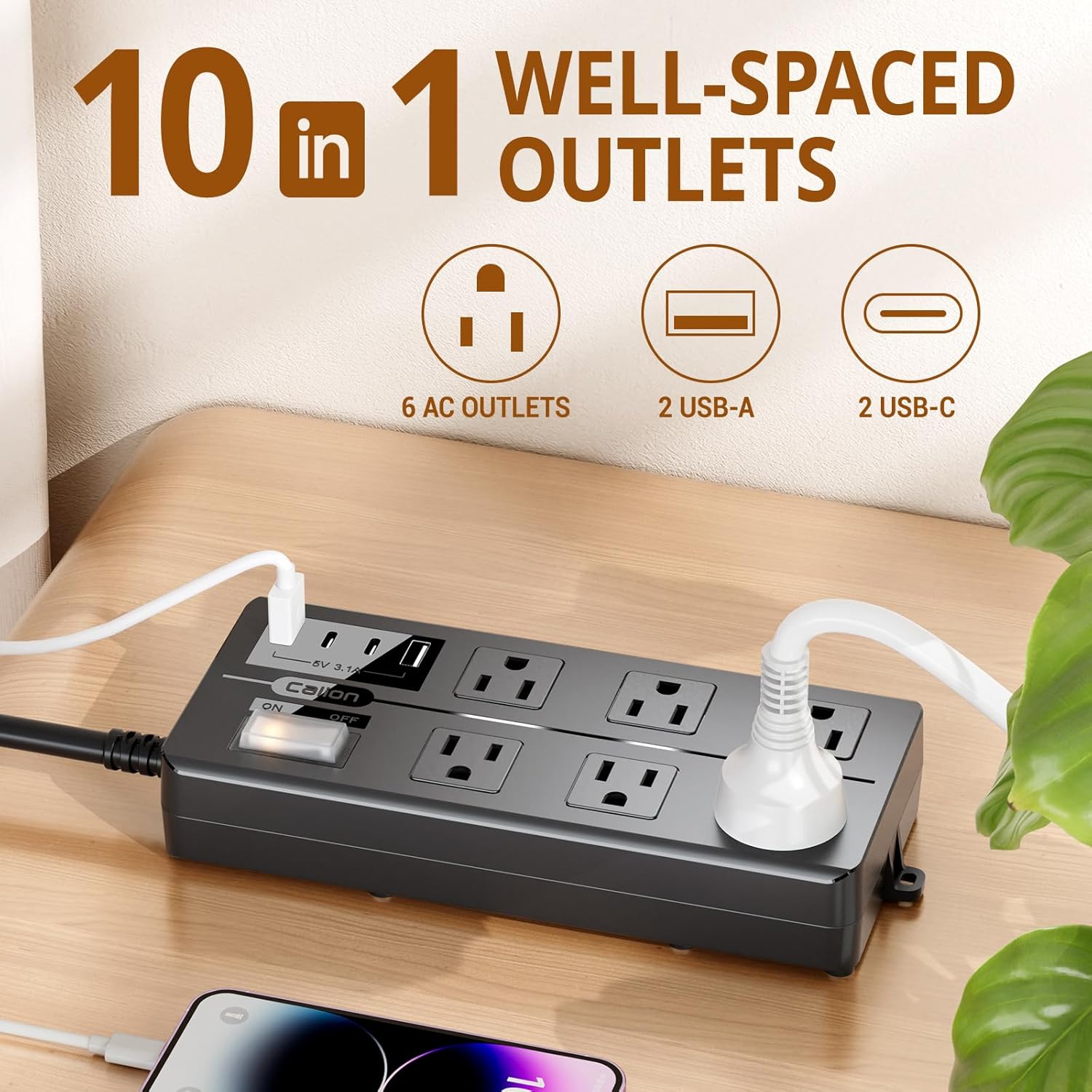 - 10 IN 1 USB-C Power Strip: Simplify your charging with this 10-foot power strip featuring 6 outlets, 2 USB-A, and 2 USB-C ports.Charge up to 10 devices simultaneously with 5V/3.1A/15.5W USB output. Compatible with most devices, it eliminates clutter and maximizes efficiency