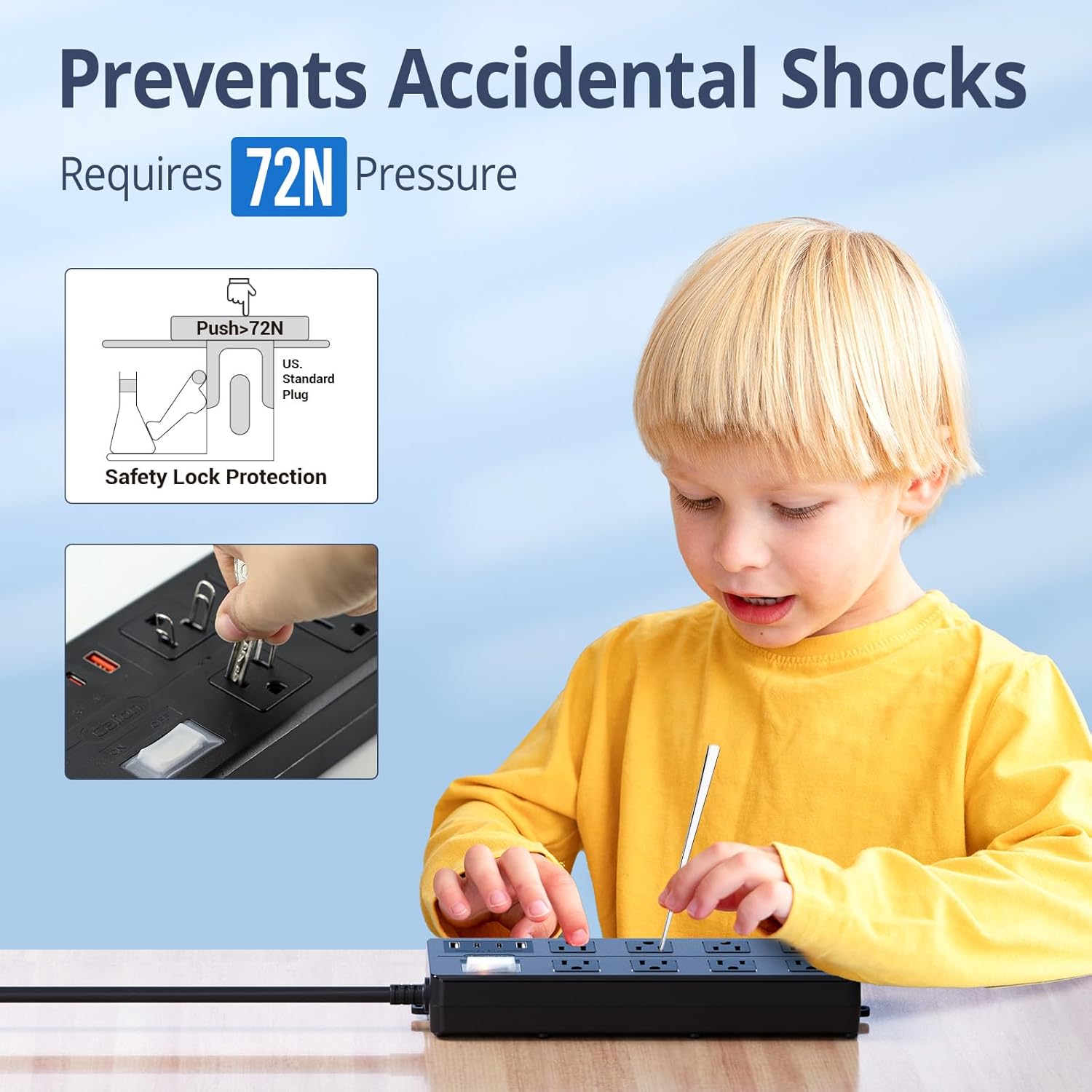 - 【Electric Shockproof Outlet Strip】: Designed for outdoor use,this shockproof strip enhances safety by preventing objects from reaching the inner circuit;Tailored for US plugs;Note: Plug insertion may require extra force due to the protective design.