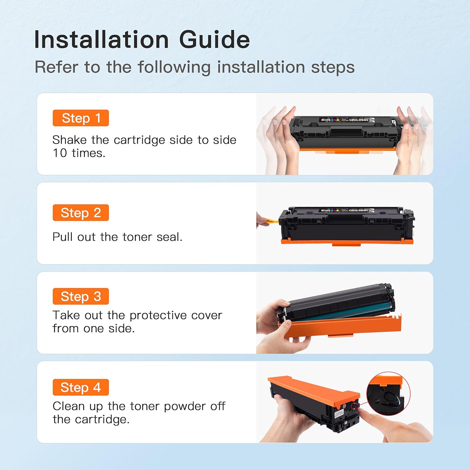- Package contents: 1x 054H toner cartridge Black, 1x 054H toner cartridge Cyan, 1x 054H toner cartridge Magenta, 1x 054H toner cartridge Yellow, (Total 4 Pack of 054 054H toner cartridge replacement for Canon 054H), 1 x User Guide,
