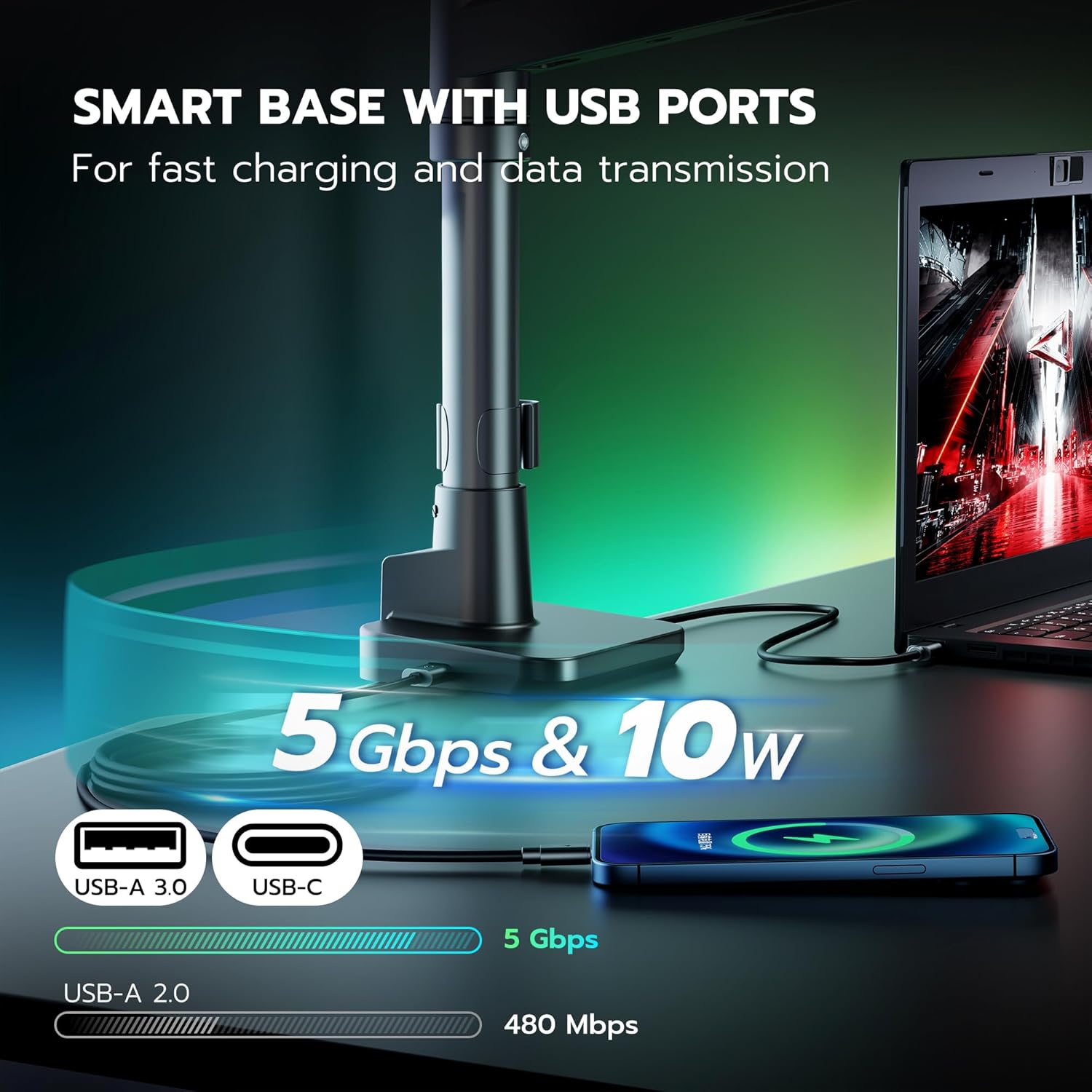 - Smart Base with USB-A/C Ports β Designed to declutter your workspace, this vesa monitor mount not only tackles cable chaos but also frees up over 80% of your desktop area. Equipped with integrated USB 3.0 ports, it offers seamless charging for your smartphones, gaming equipment, and convenient data transfer. By reclaiming valuable desk space, it creates room for your personal gadgets and dΓ©cor, enhancing both your productivity and workspace aesthetics.