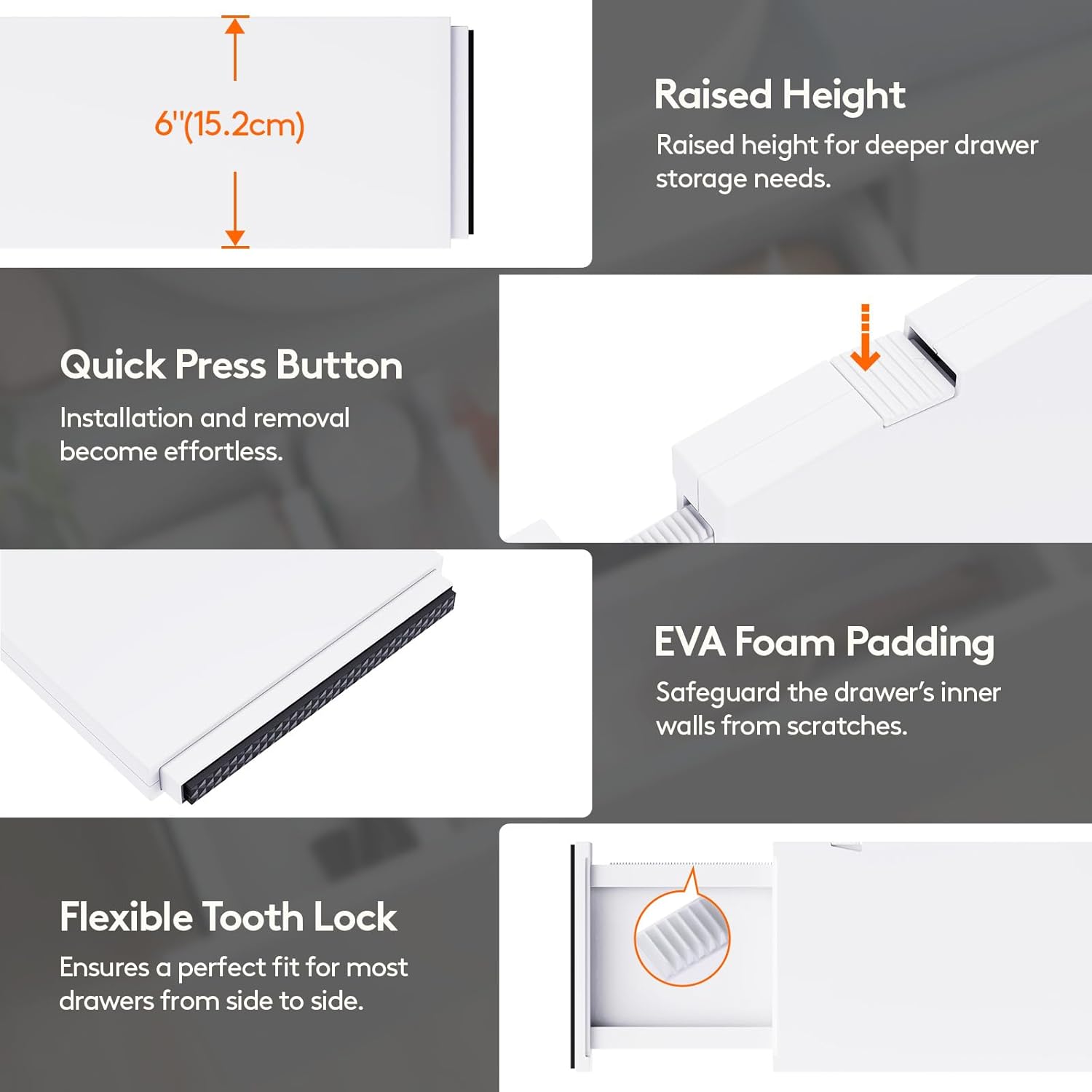 - Sturdy Construction: Made of robust ABS material, our dresser organizer features EVA foam sponges on the ends to prevent scratches and damage to your drawerβs interior, ensuring a clean and stable fit without residue; Our divider is patented (Patent No: US12133593B2)
