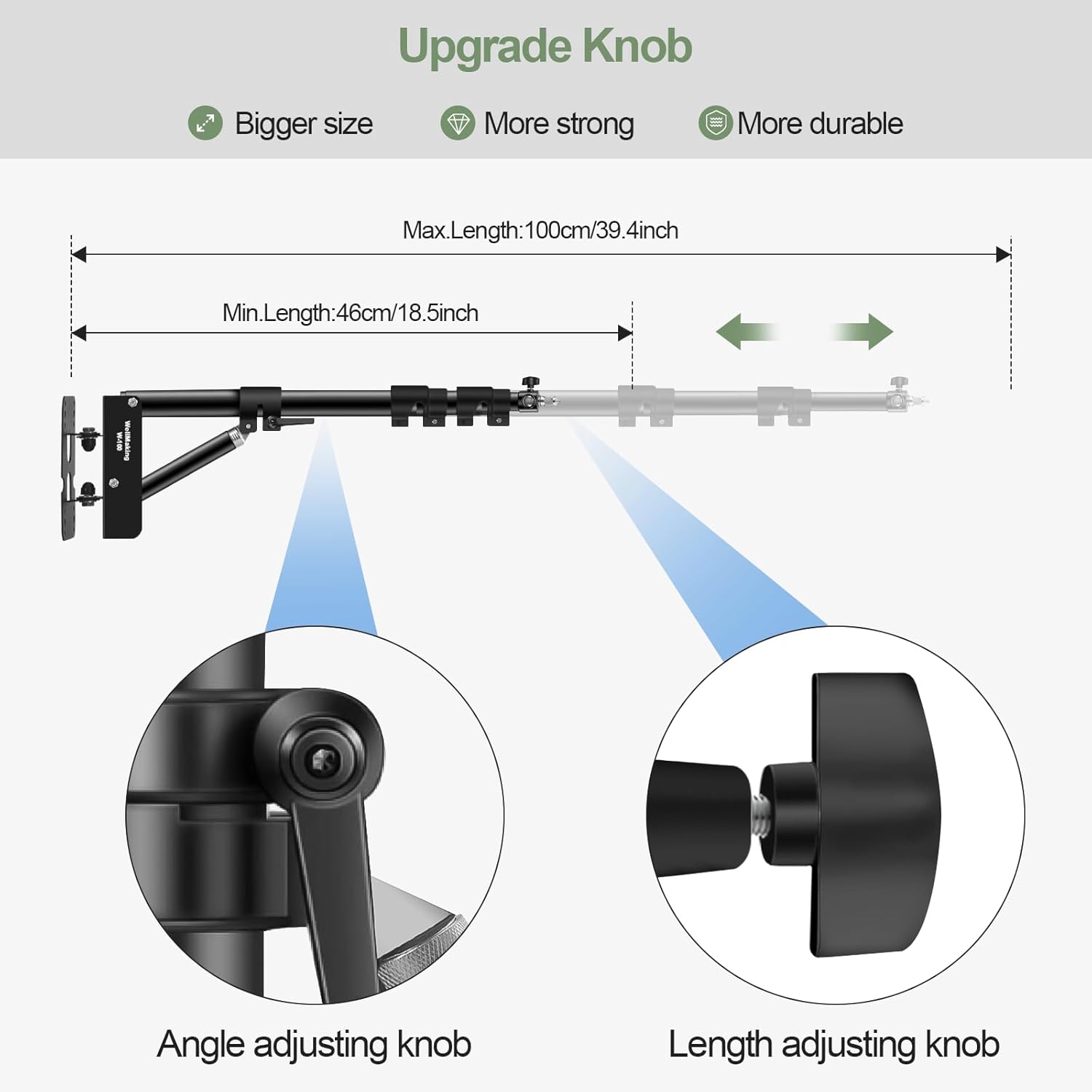 - 【Adjustable and Stable】 The triangle structure adds stability to the boom arm. So the length can be extended up to 39.37''/100cm to suit your different requirements. The ring light wall mount boom arm can be easily fixed on a solid wall or ceiling.