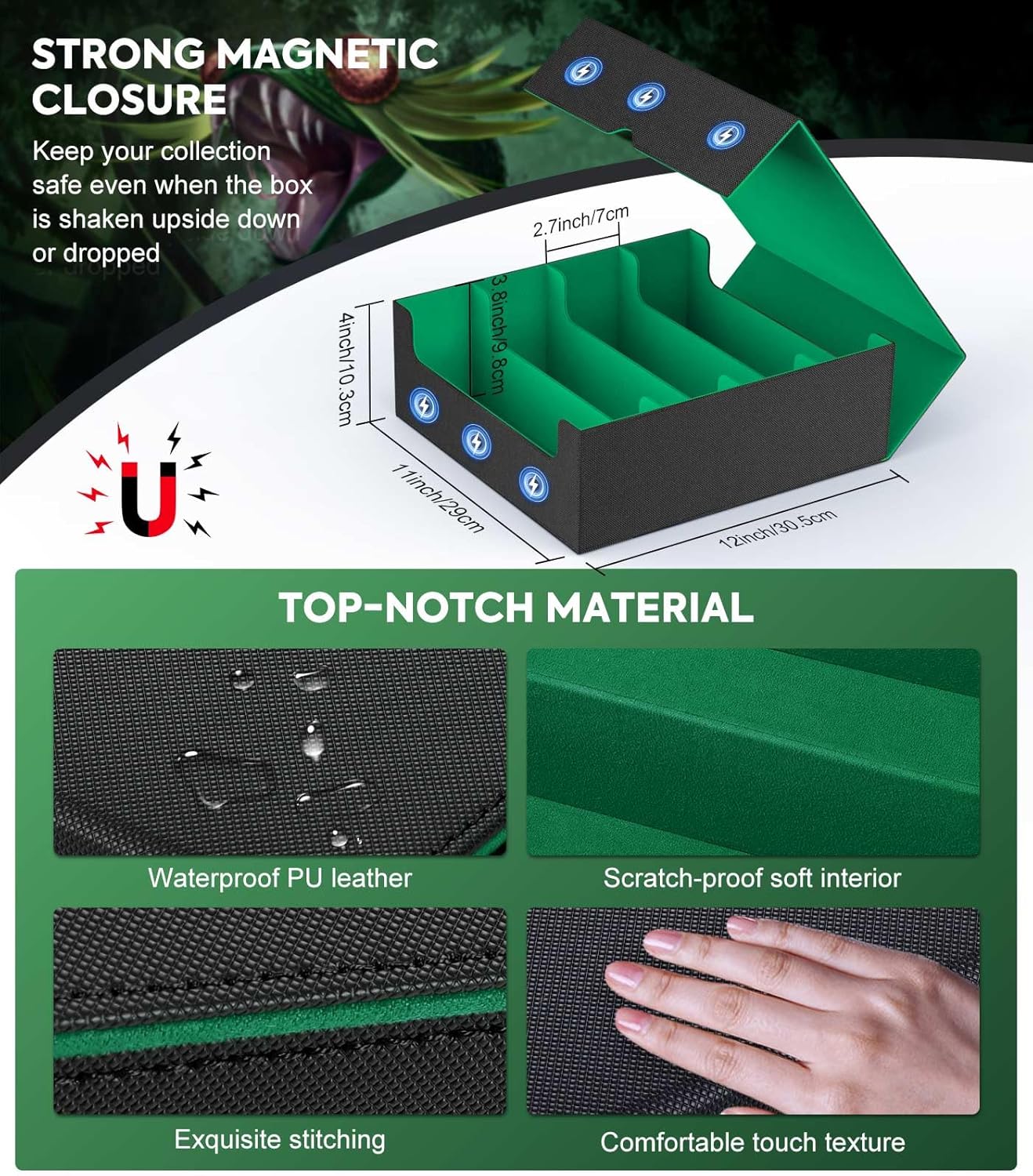 - Premium Material & Magnetic Closure: This large trading card box features a sturdy PU leather shell, waterproof, scratch-resistant, and wear-resistant, offering firmly shock protection. And a soft microfiber interior protects your cards from scratches. Equipped with powerful magnetic closures, providing security for your cards when shipping. It's an ideal choice for deck card players!