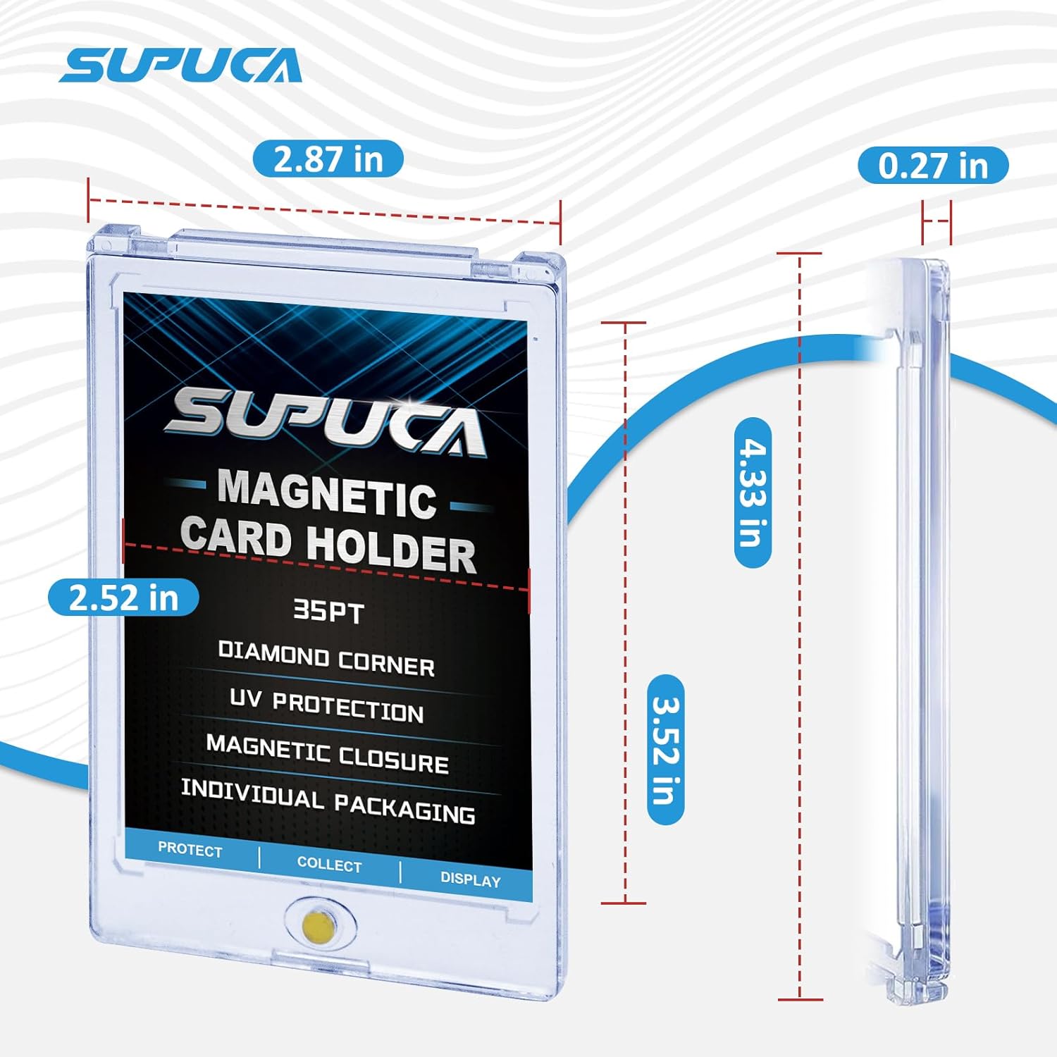 - Package Includes: 50 pack of 35pt magnetic card holders, measure 4.33"L x 2.87"W outside and 3.52"L x 2.52"W inside, sized to fit standard size (2.5" x 3.5") trading cards