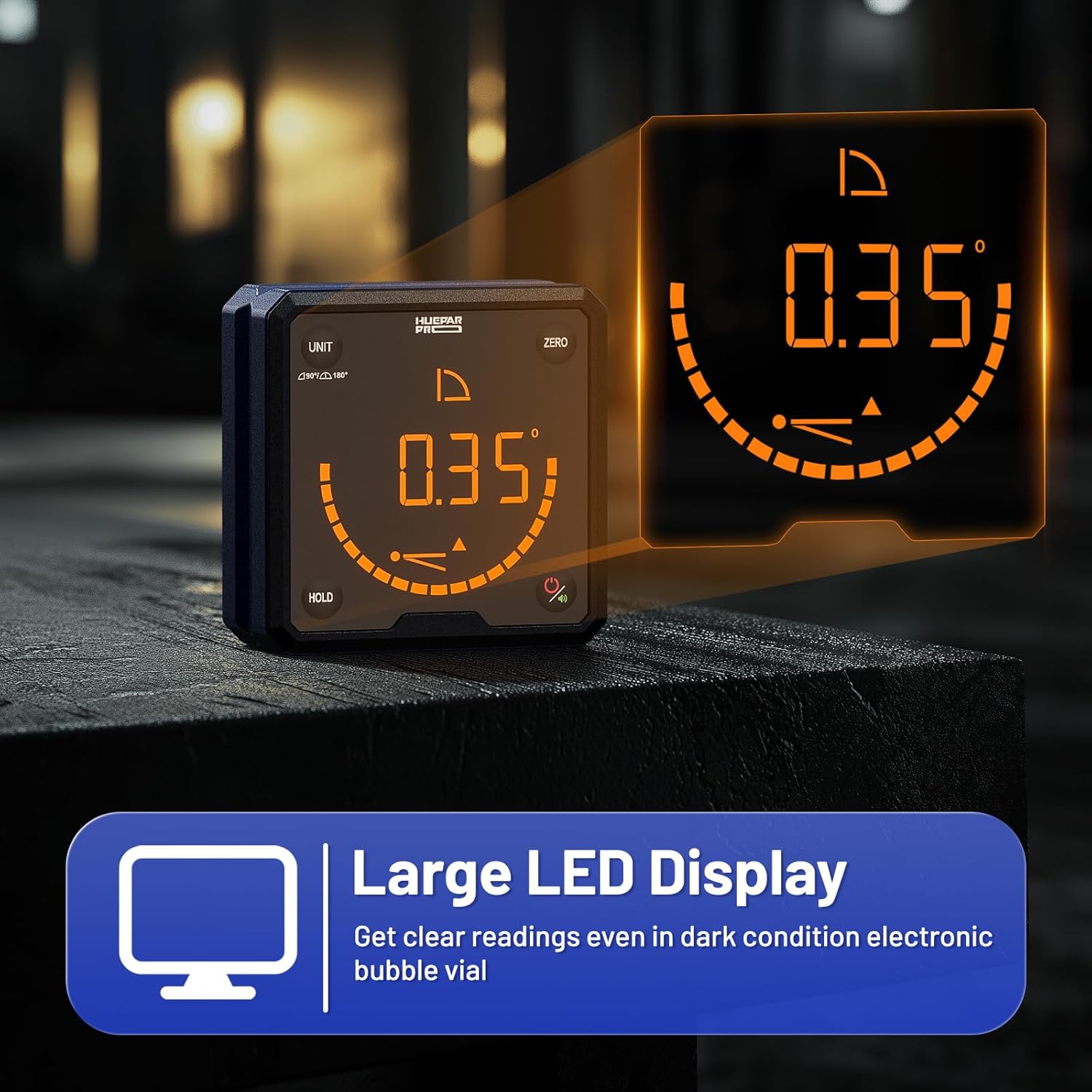 - 【Backlit LED Display & Built-in Electronic Level】The Digital Angle Gauge features a large backlit LED display, making it easy to read and quickly find the desired angle, even in low-light conditions. The backlight helps see the measurements clearly at all times. A built-in electronic bubble vial is included on the display, providing a reliable indication when you're leveling surfaces or performing other leveling tasks. This makes it an ideal tool for precision work, both indoors and outdoors