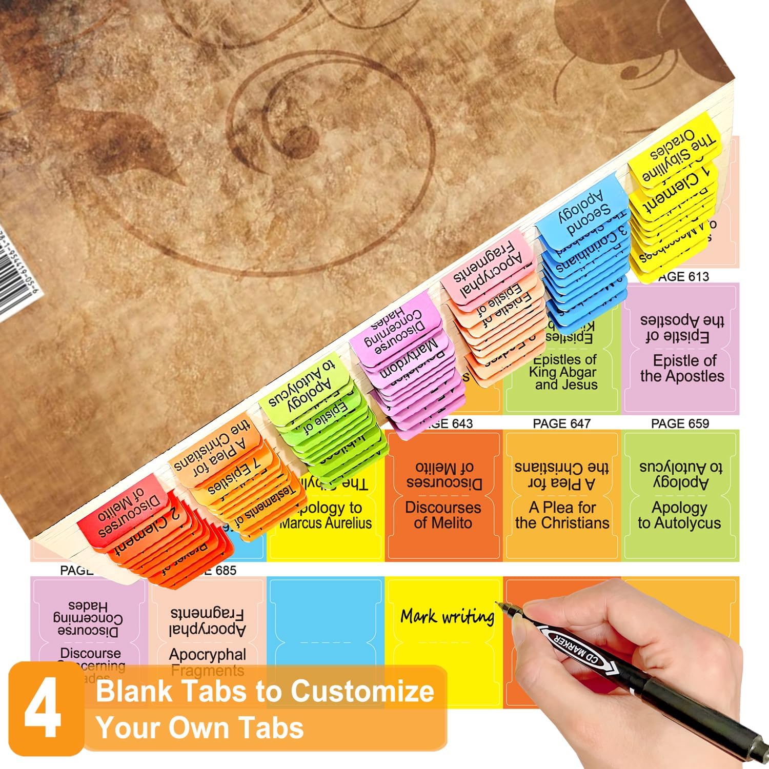 - Comprehensive Indexing: These color-coded laminated tabs provide a complete indexing system for the 100-Book Apocrypha, 2024 Edition, with 72 tabs covering 68 book chapters, 4 blank tabs, and 1 tab placement guide card