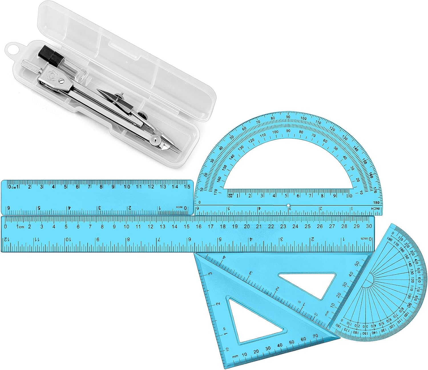- Quality Material and Design: crafted from quality plastic, the protractors and rulers are sturdy and durable, making them ideal for prolonged use; The compass is made from stainless steel, ensuring sturdiness and precision; The blue color enhances visibility, allowing you to easily see patterns or text beneath the rulers