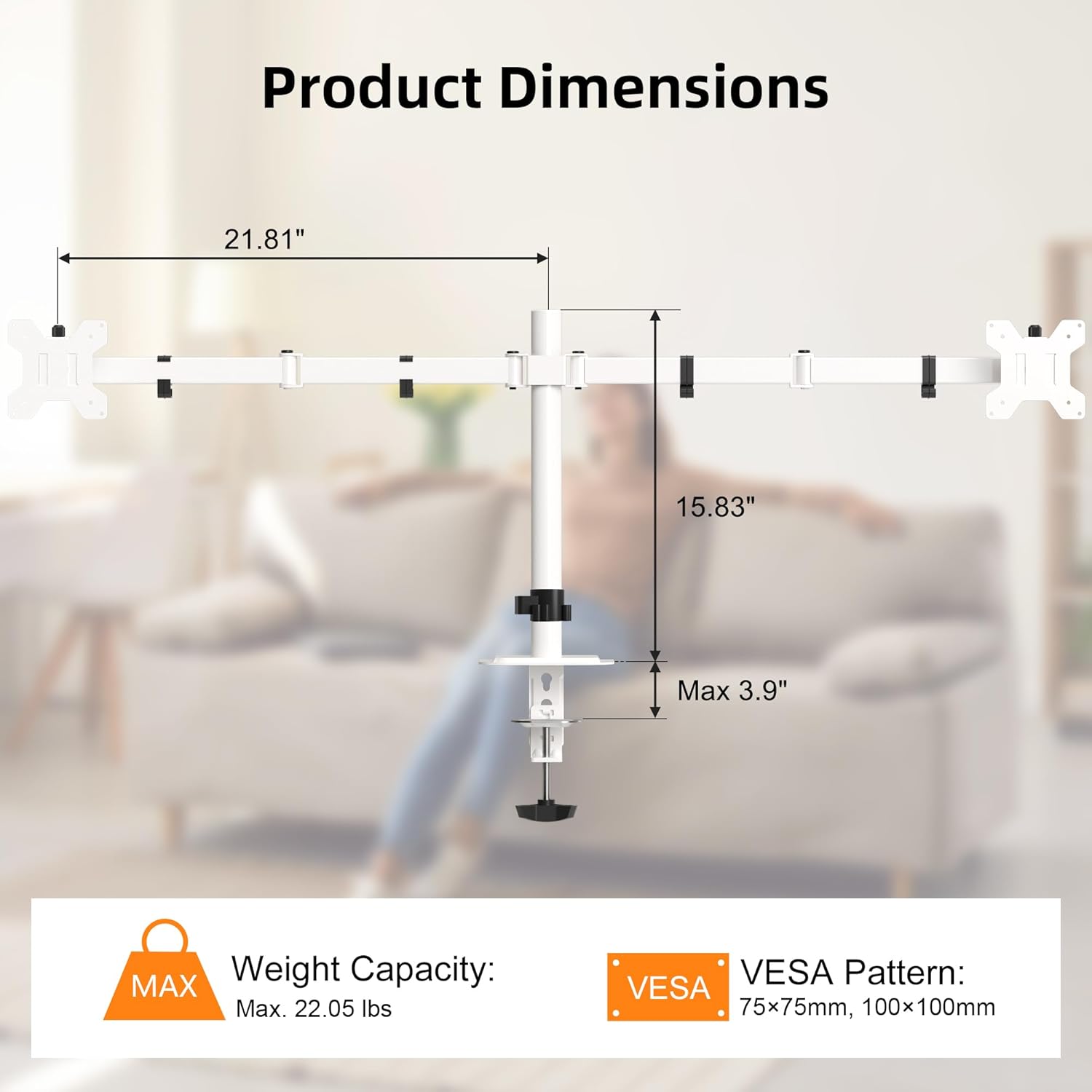 - Dual Monitor Mount: This dual monitor arm fit most for 13-42 inch screens, each monitor arm weight up to 22lbs, fit VESA 75x75mm or 100x100mm backside mounting holes. Cable management clips can make your cable become tidy.