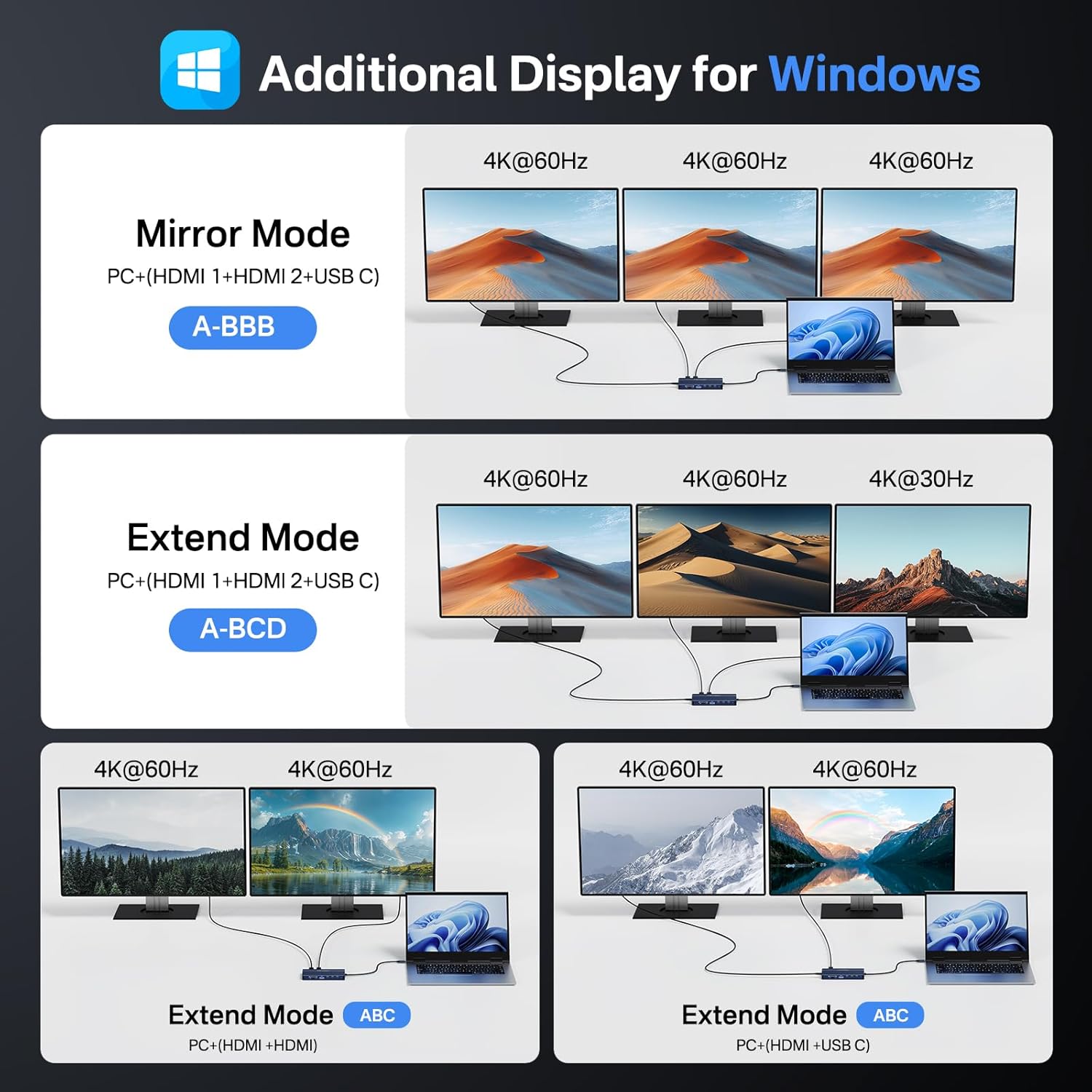 - [10Gbps full-featured USB C port]This Laptop USB C Dock is designed with a 10Gbps full-featured USB C port, which not only transfers data at 10GBps, but also supports DP alt mode.So Notebook USB C ports must support DP ALT mode or THUNDERBOLT.This laptop dock can expand 3 monitors with 2 HDMI + USB C Vedio ports. WINDOWS Laptop Support Mirror mode and Extend mode(Display three different screens simultaneously).This USBC hub is the perfectfor USB C monitor!Note: MacOS MST unsupported!!!