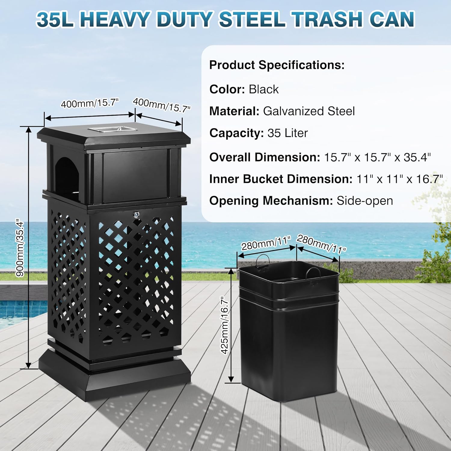 - 【Space-Efficient Square Trash Can】The IRONWALLS commercial outdoor trash can black features a compact size of 15.7"x15.7"x35.4" (40x40x90cm) that fits seamlessly into various locations without occupying excessive space. Its generous capacity (35L/9 Gallon) ensures efficient waste disposal in high-traffic areas such as stadiums, parks, gardens, patios, malls, campuses, picnic grounds, and shopping plazas.