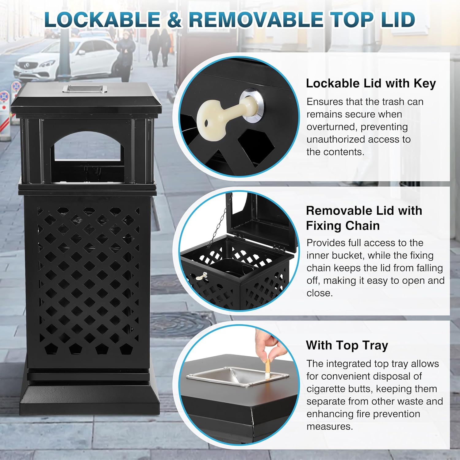 - 【Versatile Waste Container】 With super large dual-side opening and an integrated ash urn on the top lid, this outdoor trash receptacle serves as a versatile combination of an ashtray and a waste receptacle. This thoughtful design allows for convenient, hands-free disposal of cigarettes and trash in one place while effectively separating cigarette butts from other waste, reducing fire risks.