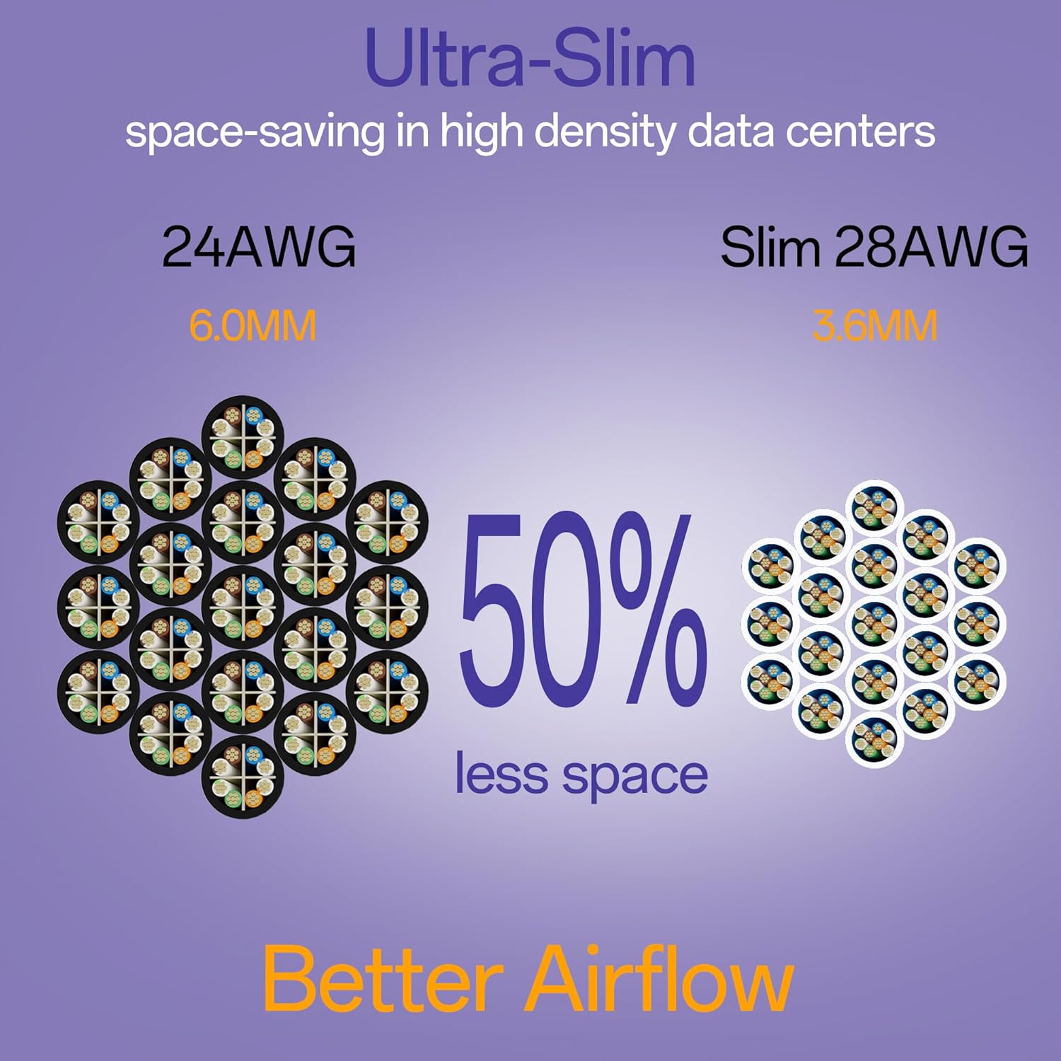 - Ultra-Slim: Slim CAT6 patch cord is 50% thinner than standard networking cables. Slim Cat6 UTP patch cable is designed for space-saving in high density environments such as data centers telecommunication and server rooms.