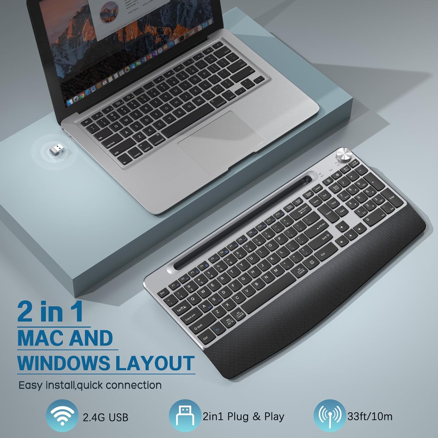 - Wireless Ergonomic Keyboard with Wrist Rest:The wireless keyboard is equipped with a wide palm rest and tilted legs, helping you keep your wrists and forearms in a more natural and relaxed posture. The low-profile wireless keyboard makes soft clicks during typing without disturbing others during rest, work or play. The specially designed volume knob enables you to make adjustments more quickly.οΌNo mouse includedοΌ