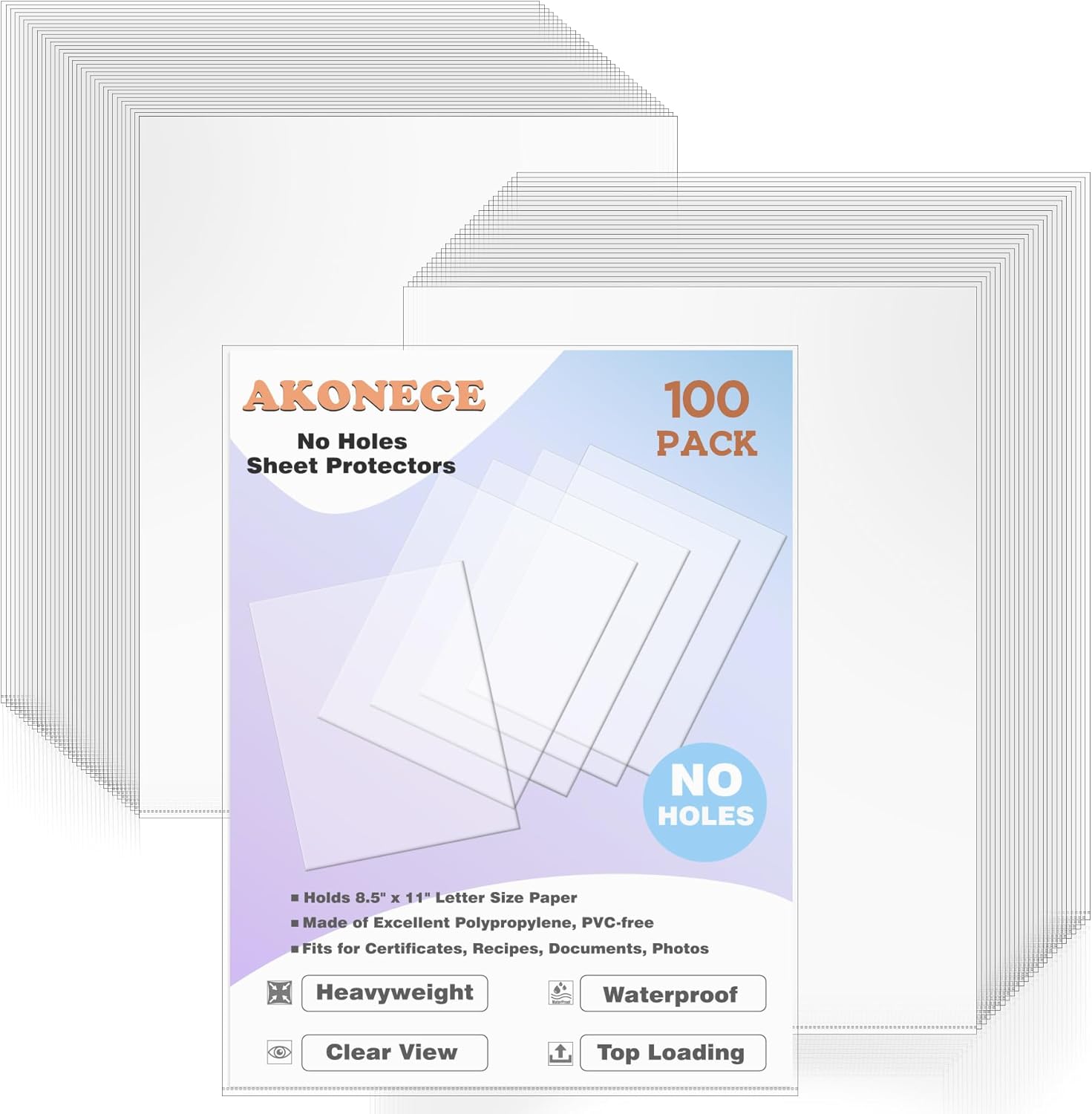 100 Pack No Holes Sheet Protectors 8.5 x 11 Inch Letter Size Page Protectors for Documents, Prints, Top Loading Heavyweight Clear View Plastic Sleeves for Papers, Artworks, Photos