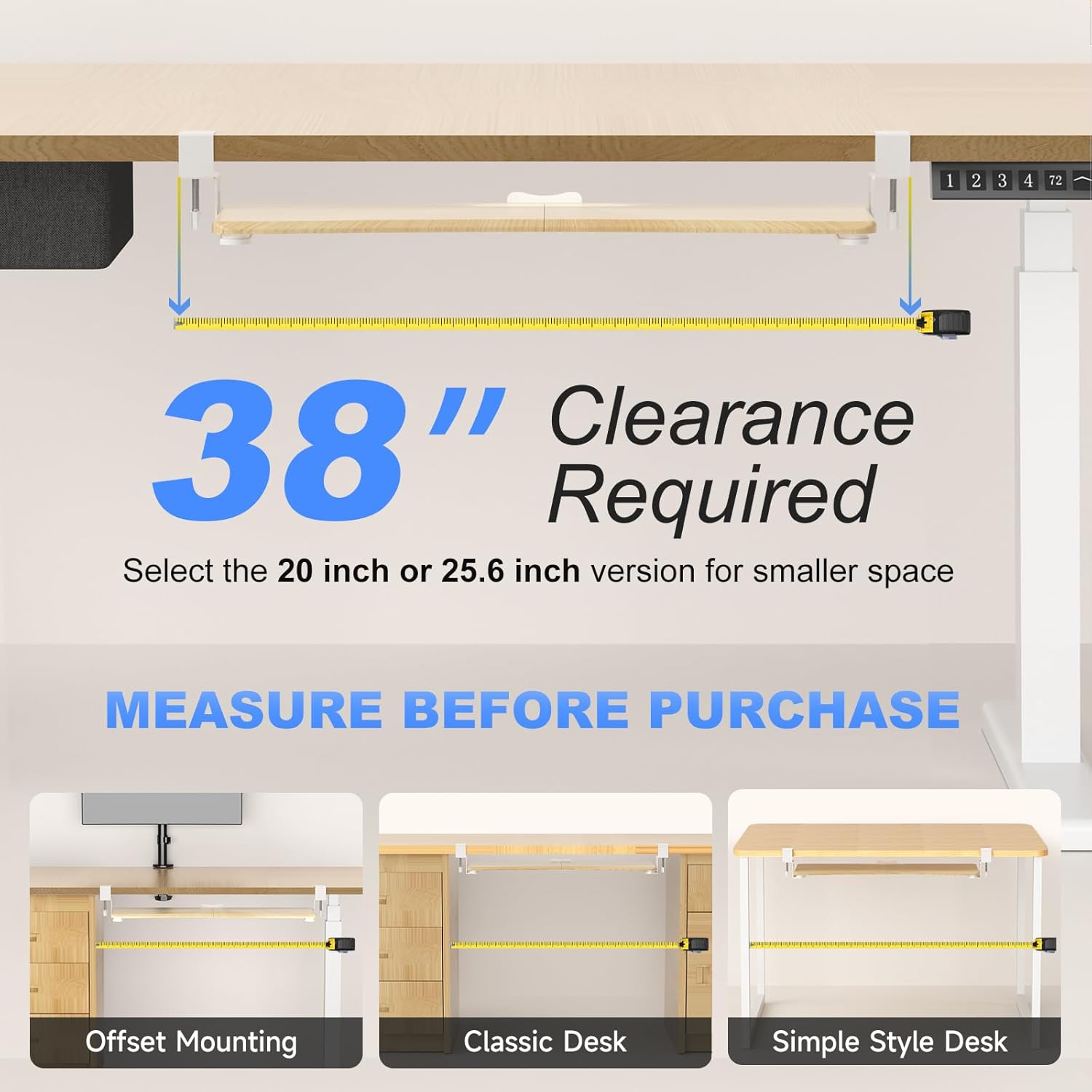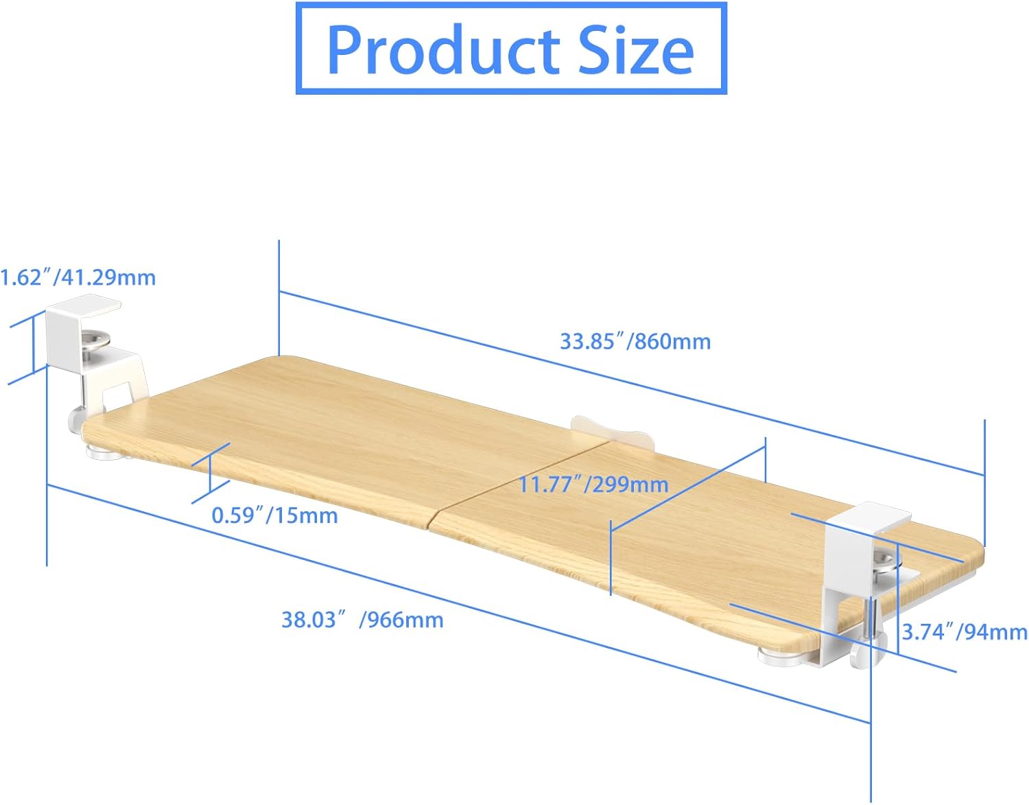 - Universal - This 34" (38" including clamps) x 11.8" under-desk keyboard tray holds your keyboard, mouse, and other small accessories below the desktop to add work space. Please not it does NOT fit if your desk thickness is over 1.57β.