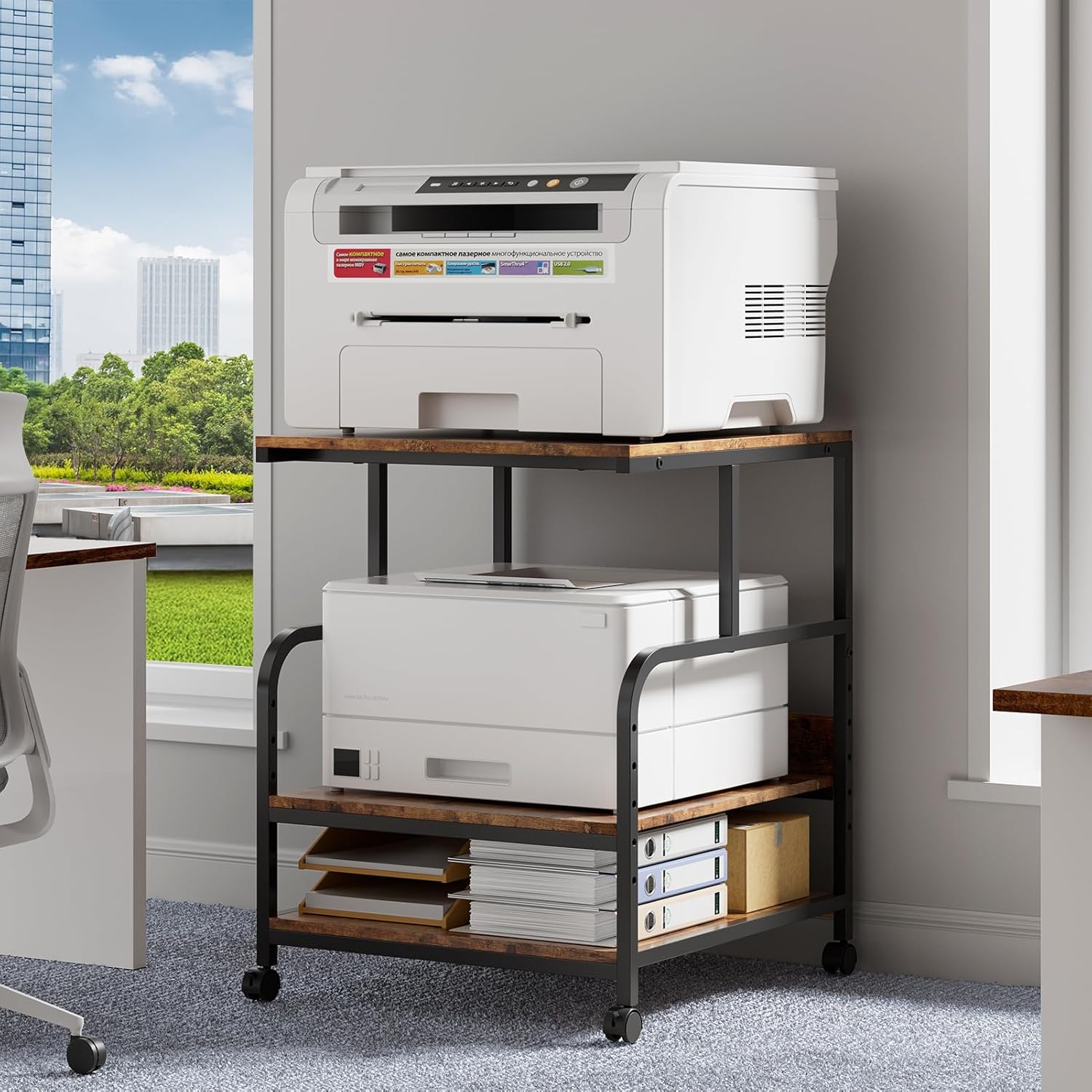 Warmiehomy 24x24 inches Printer Stand with Adjustable Storage Shelf - Large Printer Table with Wheels - 3 Tier Rolling Cart - Use for 3D Laser Printer Mini Fridge Home Office (Brown)