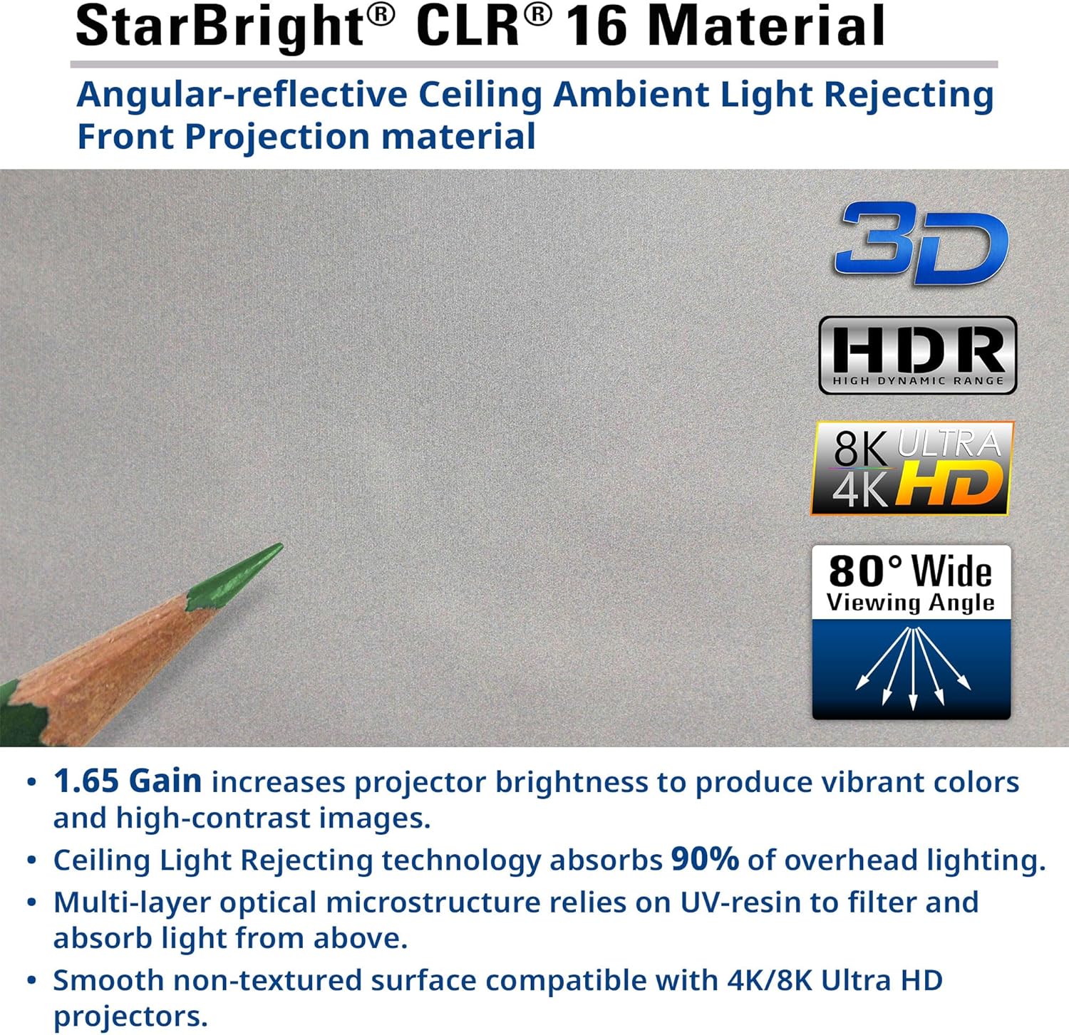 - Ceiling Light Rejecting Material: Features StarBright CLR 16 technology that absorbs up to 90% of overhead light, ensuring bright, vibrant colors and crisp contrast even in rooms with ceiling lights. The 1.65 gain boosts projector brightness for a true-to-life viewing experience.