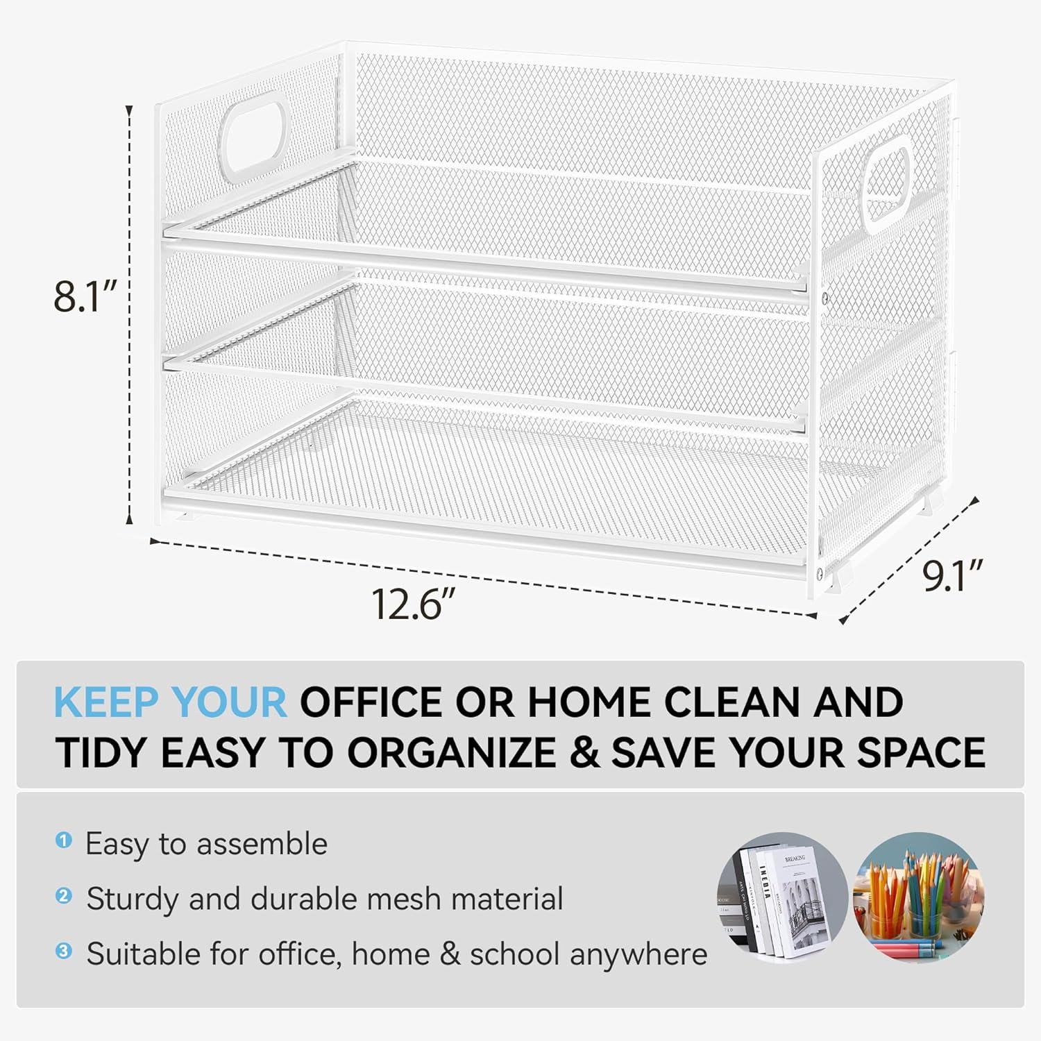 Subekyu 3 Tier Letter Tray Paper Organizer with Handle, 1 PC Sliding Tray, White Metal Mesh Desk File Folder Paper Sorter Organizer for Home Office School Desk Supplies Organization Storage