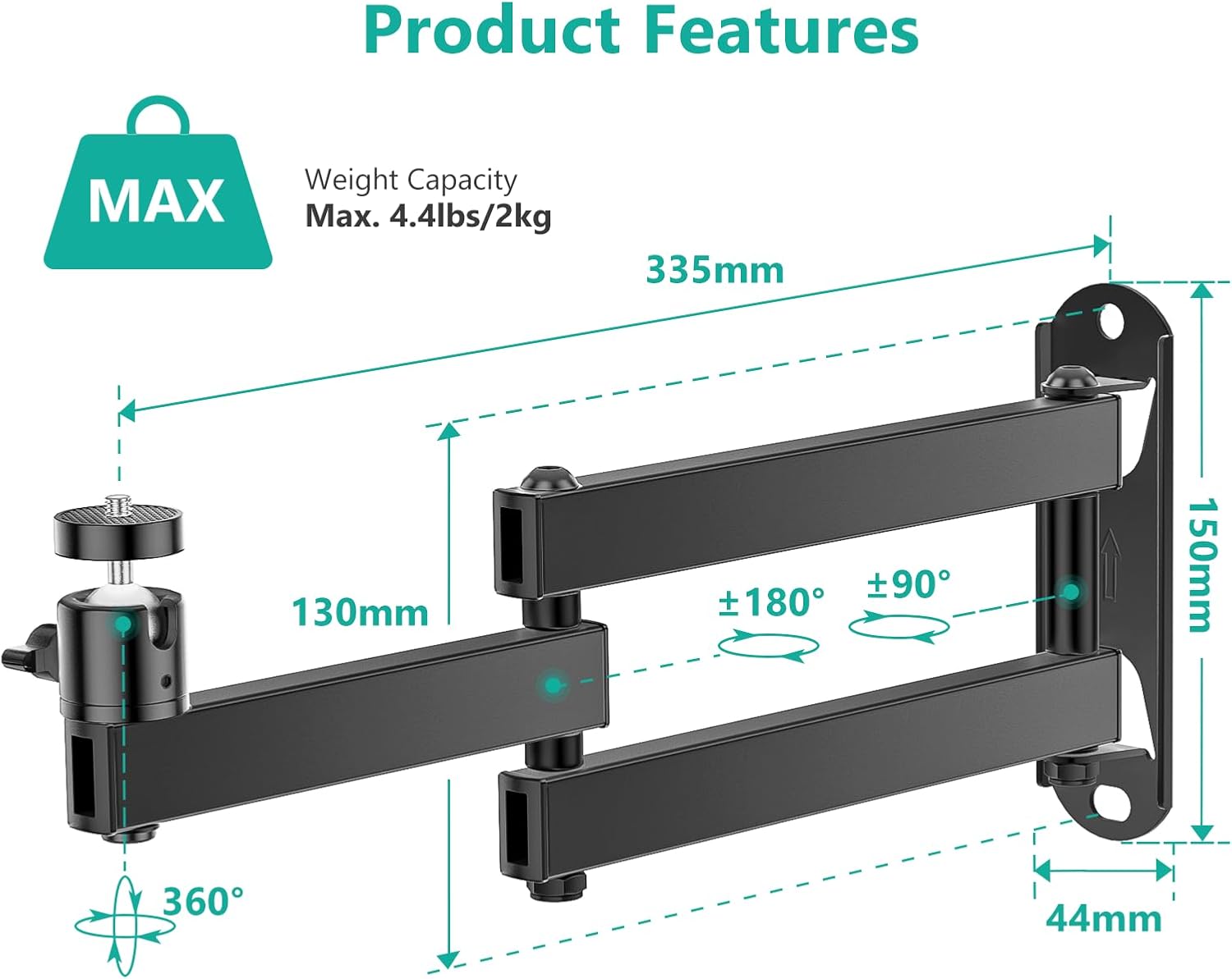 WALI Foldable Projector Wall Mount Universal Adjustable Wall Projector Mount Aluminum Alloy Projectors Stand,1/4" M4 M6 Screw Size,(1330LM-PM), Black