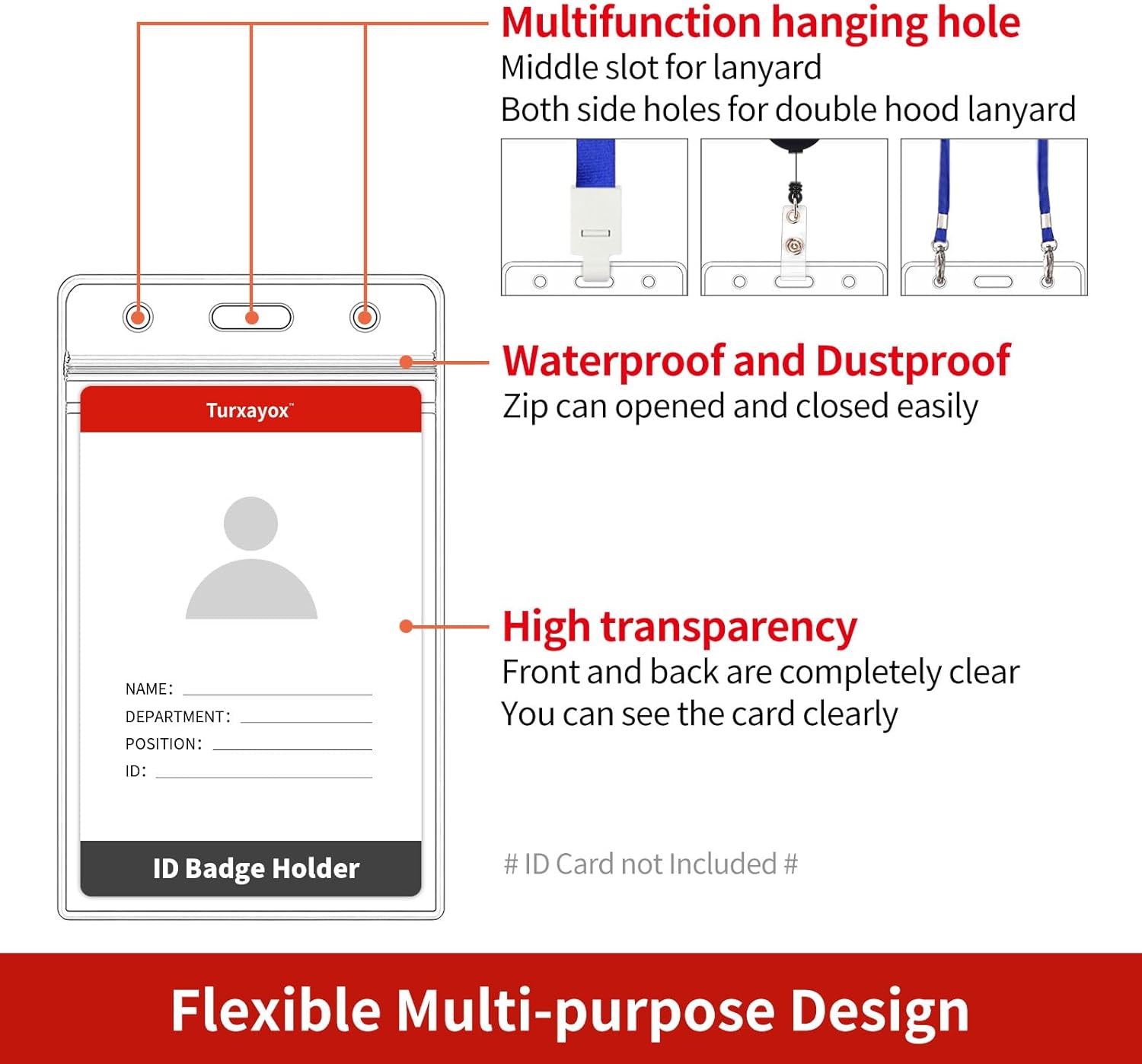 - Flexible Multi-purpose Design: Clear ID card holder features a resealable zip, making it waterproof and dustproof, ensuring the safety and dryness of your cards and money. 3 pre punched openings can attach almost all style lanyard