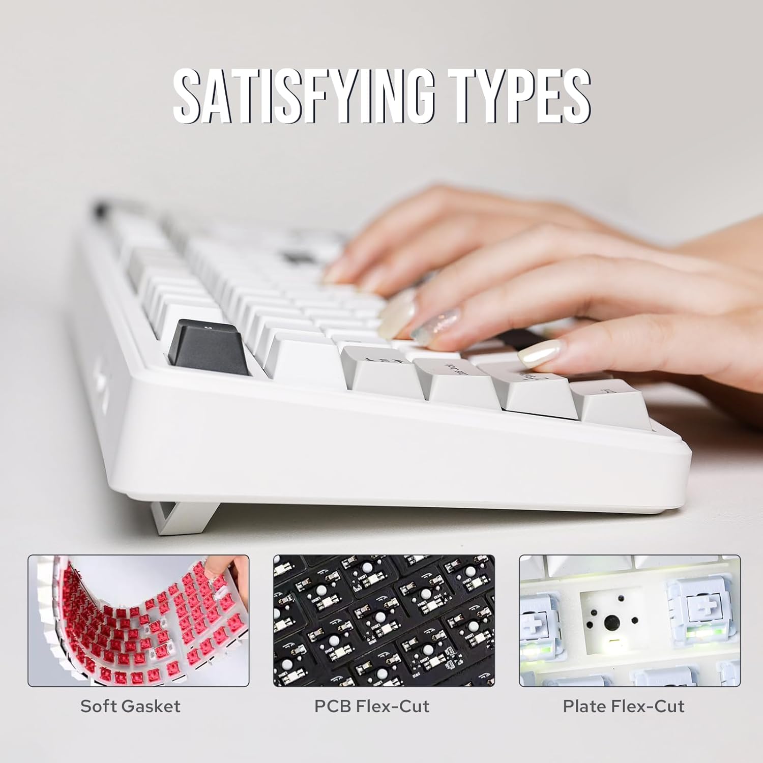- Gasket Structure&Five Layers of Sound-Improving Materials: The F99 PRO mechanical keyboard adopts a gasket structure, extended integrated silicone pad, and PCB flex-cut to optimize elasticity and stability, providing a softer and more elastic typing experience. Equipped with 5 layers of sound-dampening materials, it enhances the acoustic effect of typing. The combination of sandwich foam, IXPE switch pad, PET sound-improving film, bottom foam, and silicone shell pad helps eliminate echo and provides stable and comfortable typing sound