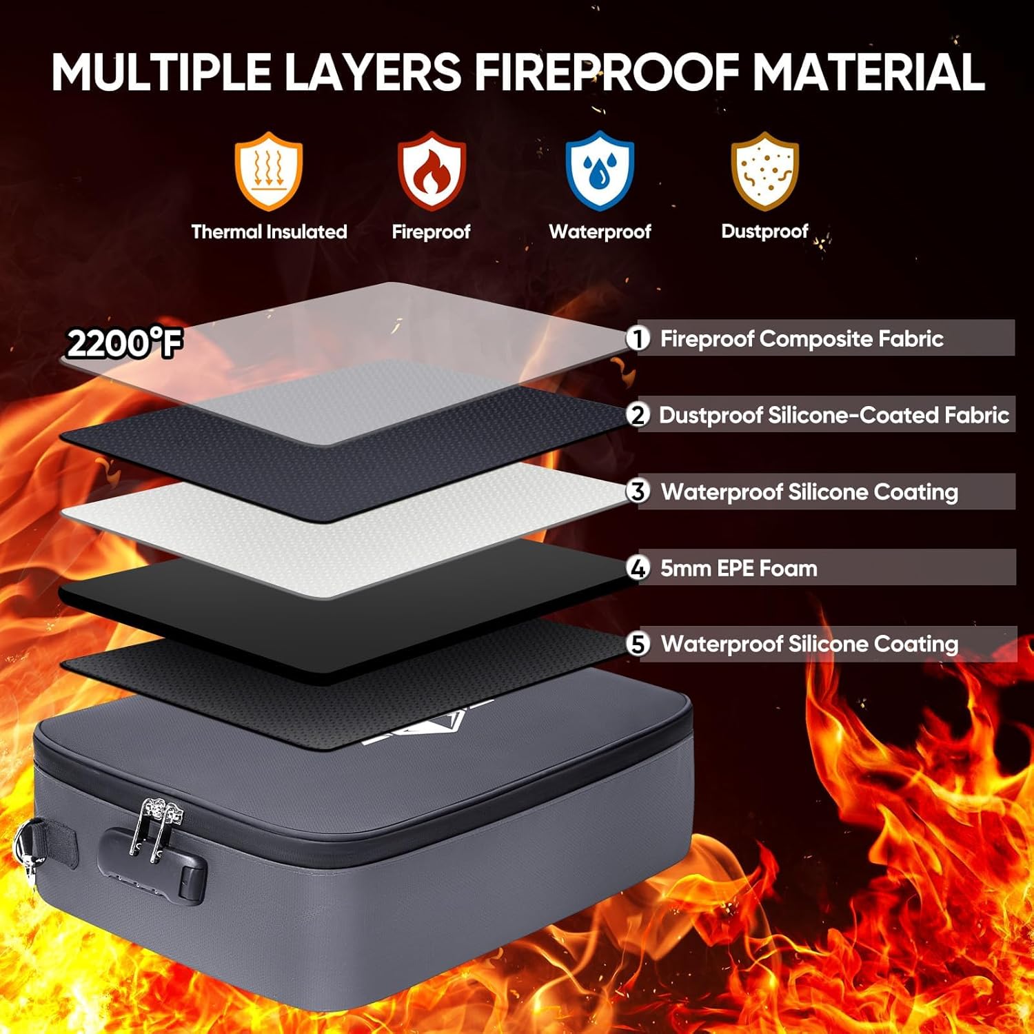 - Fireproof and Waterproof: The fireproof document box /bag is made of dust-proof silicone fiberglass, offering fire resistance up to 2192β, SGS-certified (UL94 VTM-0); Its waterproof design protects your documents from rain and spills (No folders included)