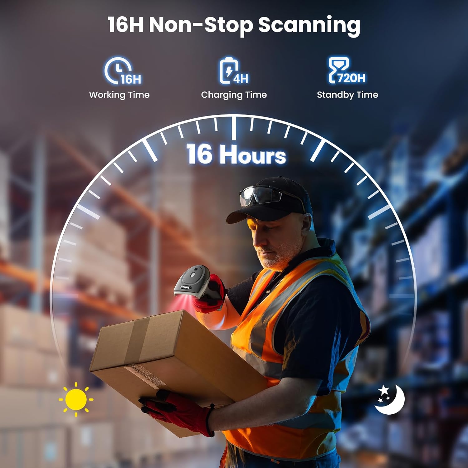 - ✅Shockproof Design & 2500mAh Battery: The bluetooth barcode scanner built to survive harsh treatment including 2 m (10 ft) drops, 1,000 1 m (3.3 ft) tumbles, working temperatures from 0°C to 40°C (32°F to 104°F) and IP54 sealing, high shock-resistant. With industry-leading 2500mah battery, full charge allows 30 working days if scans 2000 barcodes a day. Standby time > 720h.